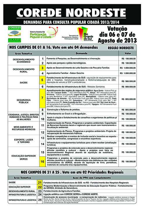 Foram eleitas as seguintes demandas do Município de Sananduva: