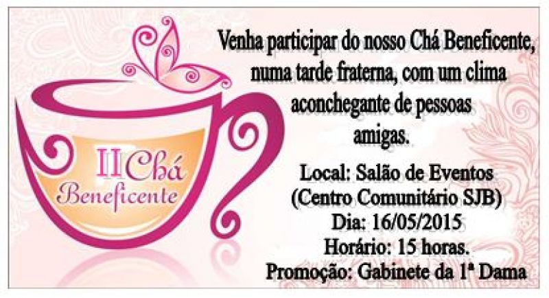 A Administração Pública através do Gabinete da Primeira Dama estará promovendo a Segunda edição do Chá Beneficente, que acontecerá no dia 16 de maio às 15 horas no Salão de Eventos do Centro Comunitário Sananduvense.