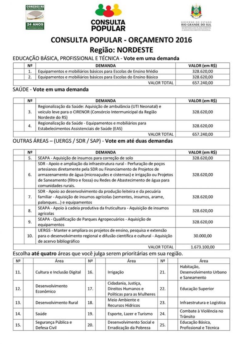 A Região Nordeste do Estado foi a primeira a ter homologada a cédula de votação para a Consulta Popular, que ocorrerá em 19 de agosto. As demandas, eleitas em audiências públicas e assembleias municipais organizadas pelos Conselhos Regionais de Desenvolvimento (COREDES), foram validadas pela Secretaria do Planejamento e Desenvolvimento Regional (SEPLAN).