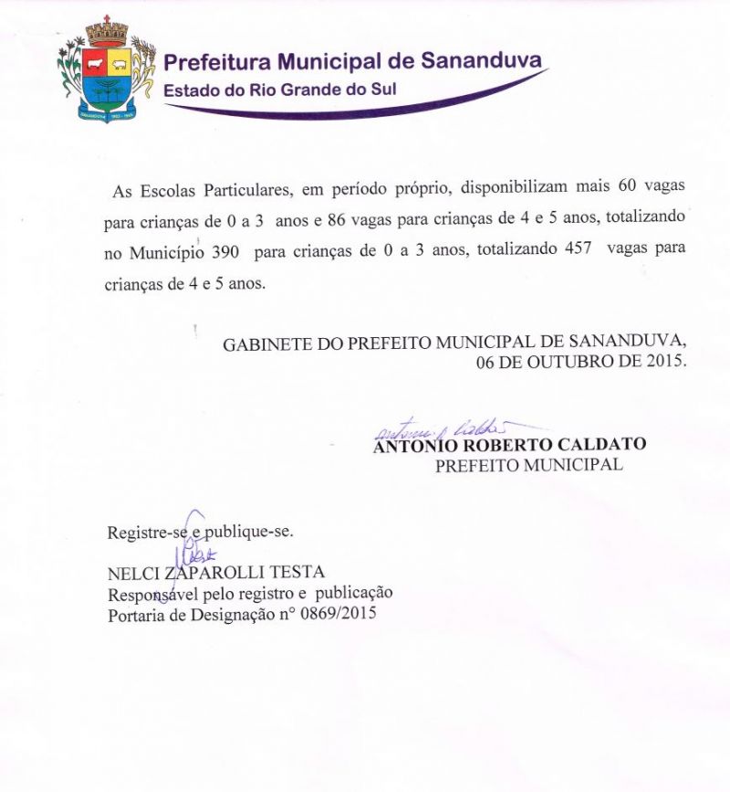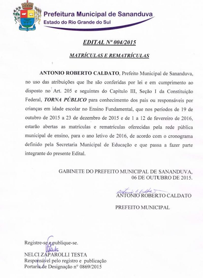 Conforme o edital publicado pelo Poder Público Municipal de Sananduva, estão abertas as matrículas e rematrículas na rede municipal de ensino.