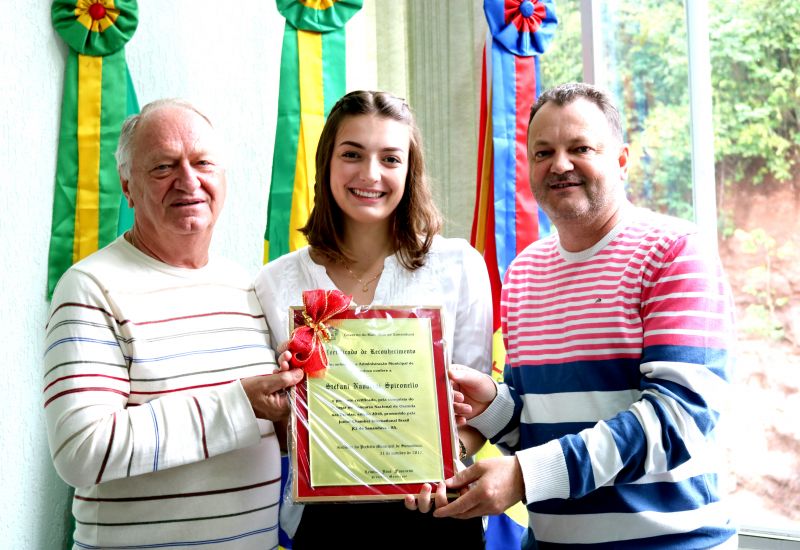 Durante a visita no Gabinete do Executivo, ela foi agraciada com o Certificado de Reconhecimento pelo importante título. “Você se tornou um belo exemplo a ser seguido, de força de vontade e de empenho em alcançar seus objetivos. Parabéns a você e a todos que te apoiaram nessa vitória”, declarou o prefeito. No ato da entrega do Certificado, Stéfani foi prestigiada pela mãe, pela diretora do Colégio Estadual Sananduva, professores e representante da JCI Sananduva.