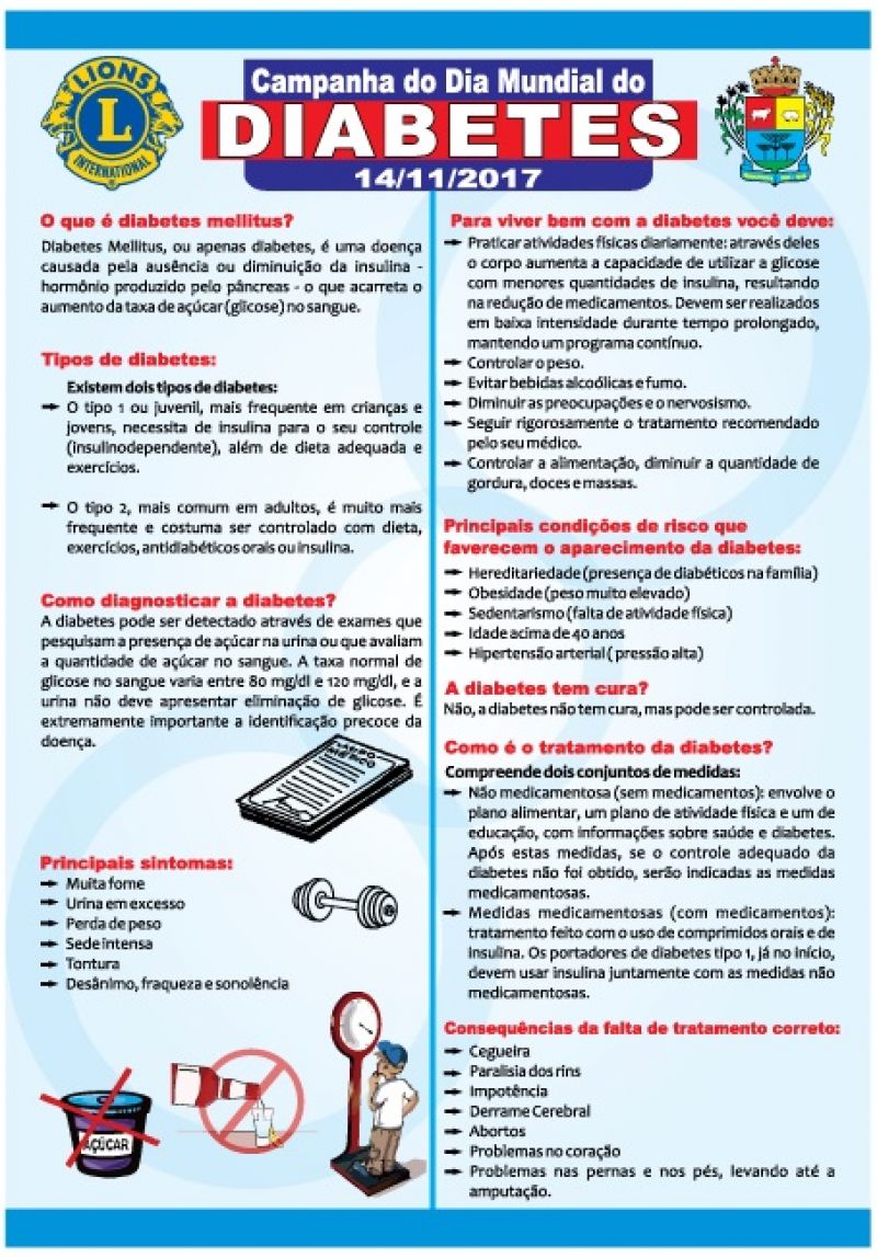 No dia 14 de novembro (terça-feira), em frente a UBS do Centro, serão oferecidos Hemoglicotestes – HGT, exame de sangue que tem como objetivo determinar a quantidade de açúcar (glicose) no sangue. Além disso, haverá distribuição de folderes e orientações para a população em geral, com foco na conscientização, prevenção e controle da doença.
