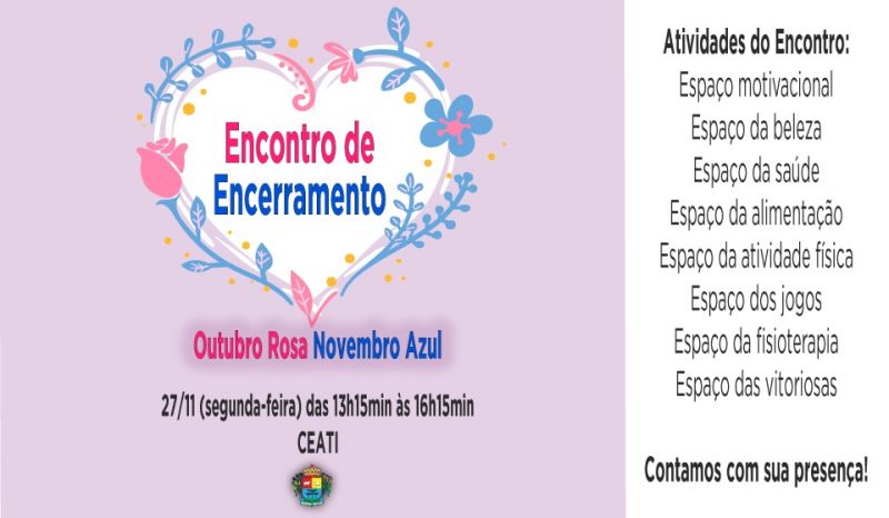 As atividades foram agregadas com o objetivo de atingir o maior número de munícipes com orientações e exames preventivos de rotina, oferecendo o acesso amplo às informações e serviços gratuitos. E para encerra as programações, no dia 27 de novembro acontece um grande evento no Ceati, das 13h15min às 16h15min. A tarde será dinâmica, dedicada a promover à saúde e prevenir doenças, buscando melhorar a qualidade de vida. Espaço das vitoriosas, de motivação, beleza, saúde, alimentação, atividade física, jogos e fisioterapia estarão à disposição para atender a comunidade. Participe!