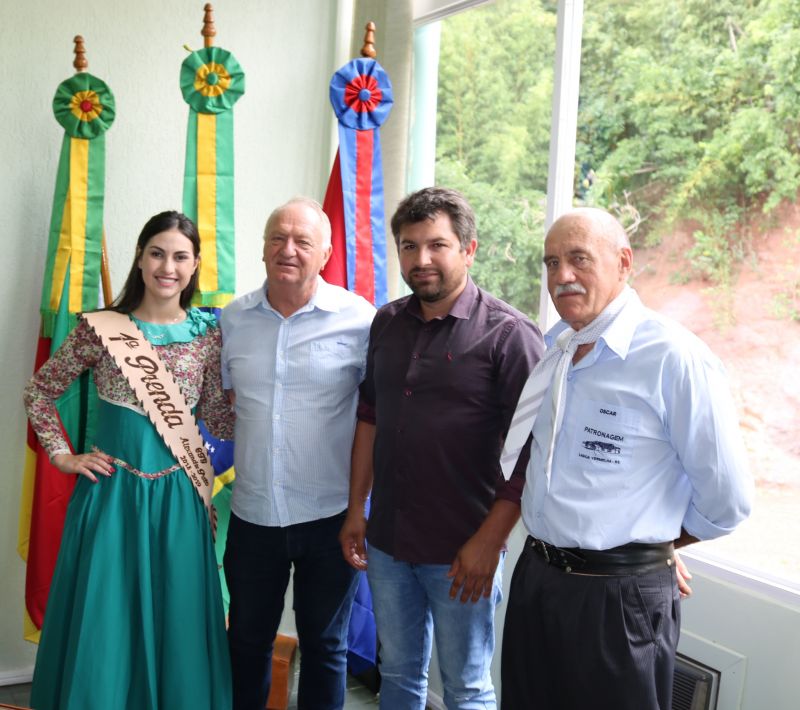 Estiveram no gabinete do prefeito Leomar José Foscarini, na tarde desta segunda-feira (07), o vice-prefeito de Lagoa Vermelha, Clóvis Neckel, o tesoureiro do CTG Alexandre Pato, Oscar Franciscon, e a 1ª Prenda do CTG, Eduarda Gomes da Silva. Na oportunidade o prefeito recebeu convite para participar do V Rodeio Crioulo Internacional e XIX Festa Nacional do Churrasco que acontece de 30 de janeiro a 03 de fevereiro. Além do tiro de laço vão acontecer outras atrações como shows, mostra de fotografias, doces e comidas campeiras.