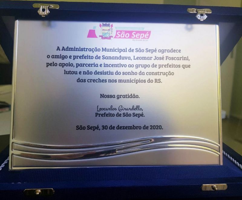 Com muito esforço e dedicação do Executivo Municipal, a creche Nona Amábile, em Sananduva, foi inaugurada no dia 28 de fevereiro após o Governo do Município assumir a responsabilidade para retomar as obras da Escola, localizada no Bairro Giusti, hoje em pleno funcionamento. Durante o discurso em São Sepé, o prefeito Leomar José Foscarini cumprimentou as autoridades pela conclusão da obra e principalmente por priorizar a educação de qualidade na gestão municipal. “Estou aqui pela amizade e pelo respeito que tenho pelo Léo, mas principalmente para celebrar essa grande conquista para a educação que é de todos”, disse. No ato, o prefeito Leomar foi homenageado pelo colega com uma placa de reconhecimento.