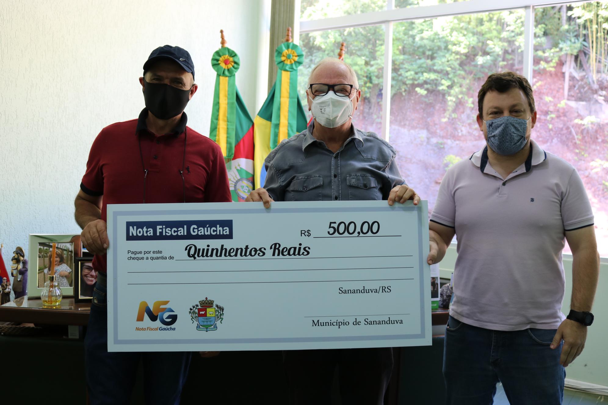 Na segunda-feira (05/04) foi realizada a entrega da premiação do sorteio do Programa Nota Fiscal Gaúcha. A entrega do prêmio foi realizada na Prefeitura Municipal de Sananduva, com a presença do prefeito Kiki, secretário do Planejamento Rodrigo Getelina e do contemplado da vez, Iraci Galon.