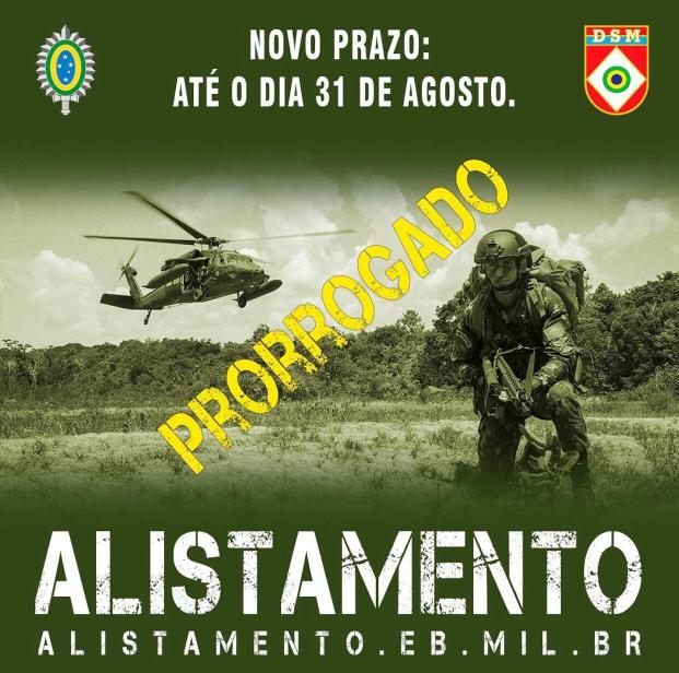 O Governo Federal prorrogou até o dia 31 de agosto de 2021 o prazo para o alistamento militar de jovens nascidos no ano de 2003 e classes anteriores, devido ao enfrentamento da pandemia da Covid-19. O mesmo deve ser feito pelo endereço eletrônico https://alistamento.eb.mil.br/ ou presencialmente na Junta Militar localizada na Prefeitura Municipal.