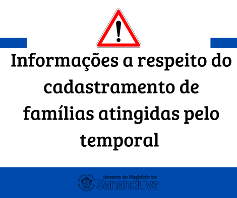 O Governo do Município de Sananduva comunica que a central de cadastro e levantamento de residências afetadas pelo temporal vai estar em funcionamento a partir das 9h desta terça-feira (27), no Centro Esportivo Municipal Victor Camozzato.