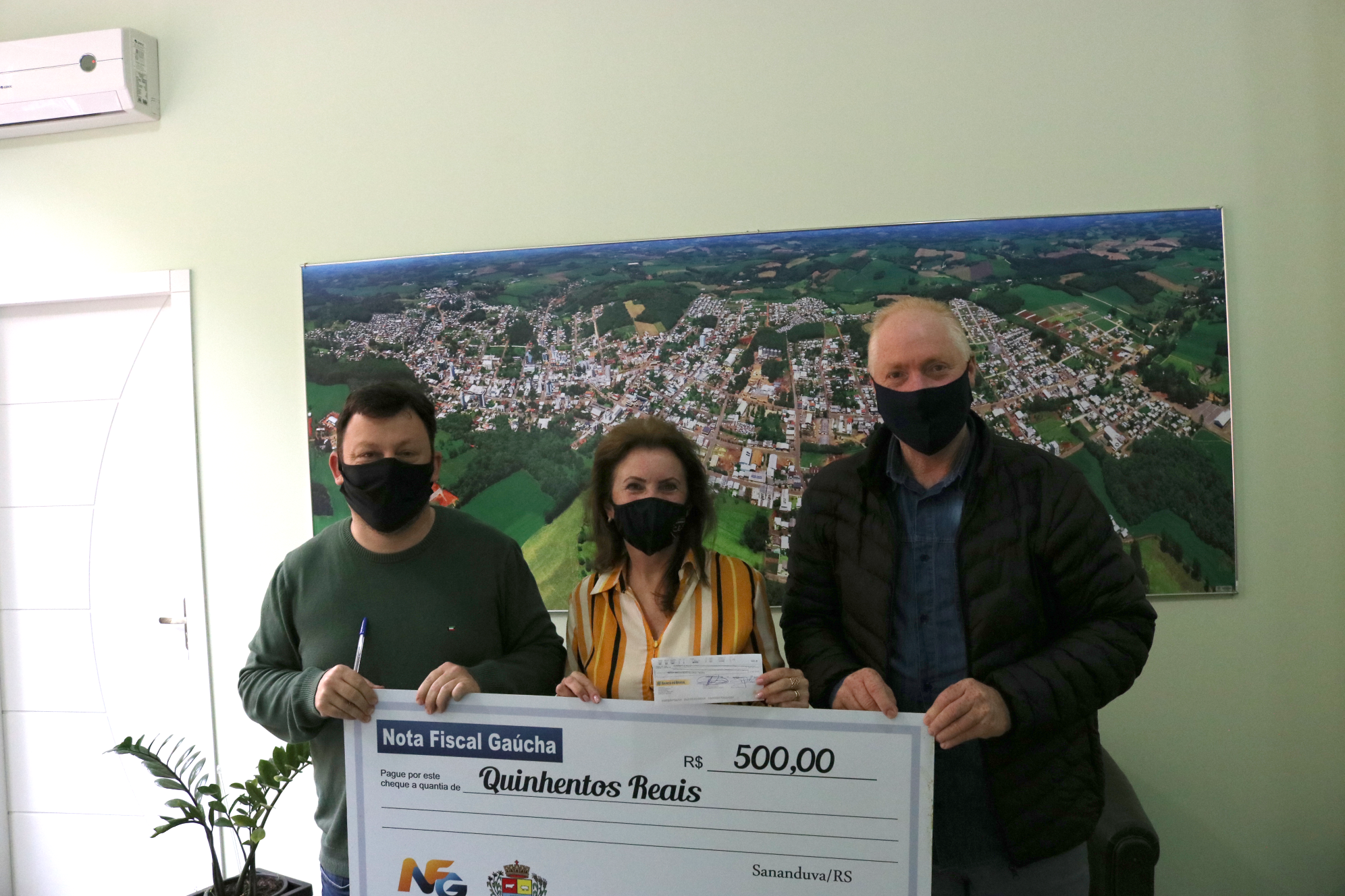 Na sexta-feira (06) foi realizada mais uma entrega de premiação do Programa Nota Fiscal Gaúcha. A entrega foi realizada na Prefeitura Municipal de Sananduva, com a presença do prefeito Vermelho Pansera, do secretário do Planejamento e Desenvolvimento Econômico Rodrigo Getelina e da contemplada, Nédia Maria Bortolossi Testa.