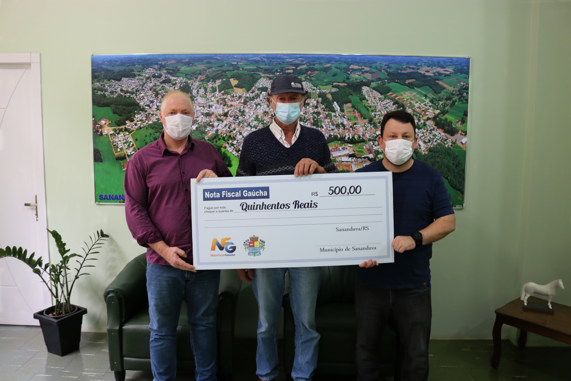 Nesta sexta-feira (15) foi realizada mais uma entrega de premiação do Programa Nota Fiscal Gaúcha. A entrega foi realizada na Prefeitura Municipal de Sananduva, com a presença do prefeito Vermelho Pansera, do secretário do Planejamento e Desenvolvimento Econômico Rodrigo Getelina e do contemplado, Odilso Antonio Rossi.