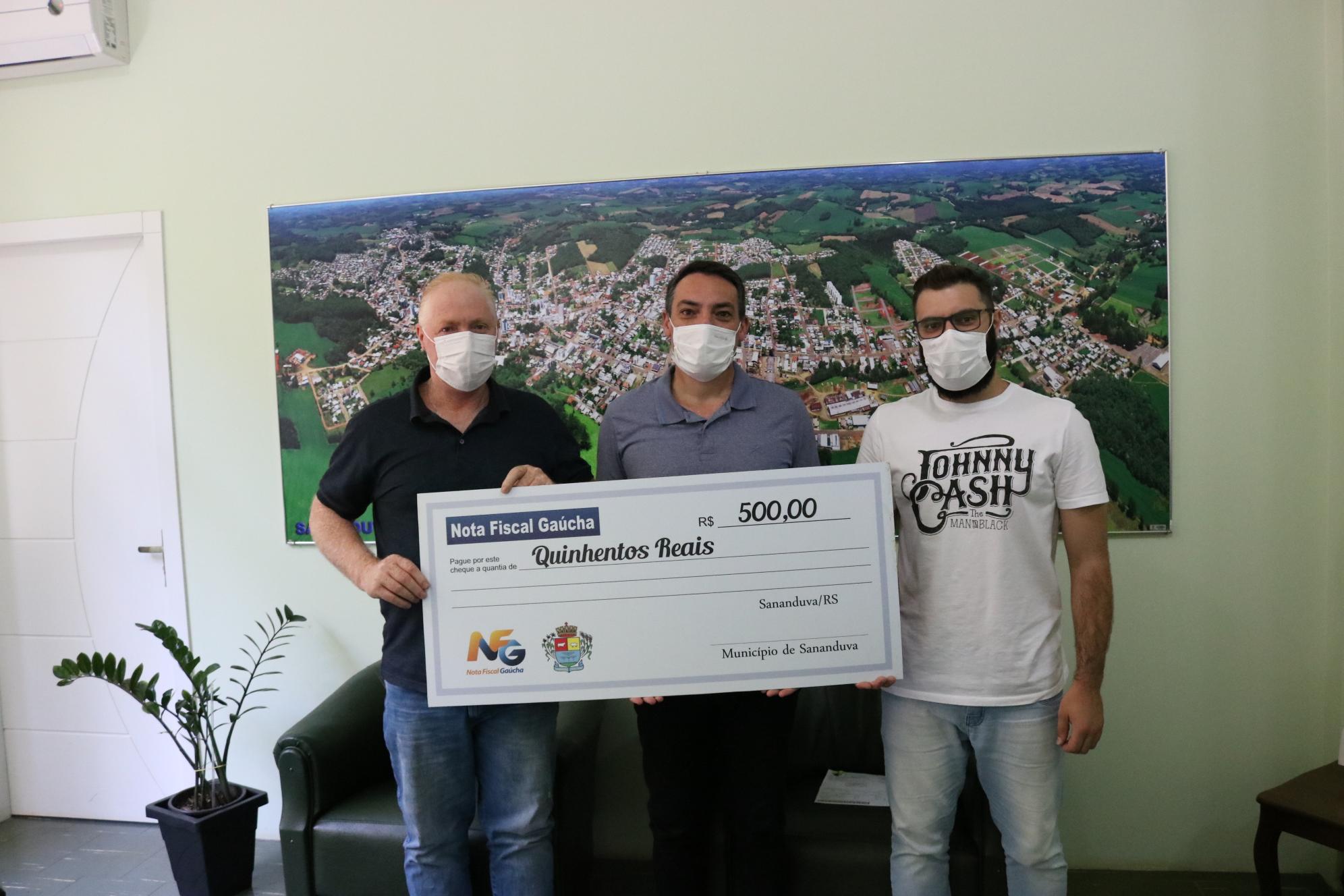 Na manhã desta terça-feira (09) foi realizada mais uma entrega de premiação do Programa Nota Fiscal Gaúcha. A entrega foi realizada na Prefeitura Municipal de Sananduva, com a presença do prefeito Vermelho Pansera, do servidor Alef Schiavon Segalla e do contemplado, Sedenir Brunetto.