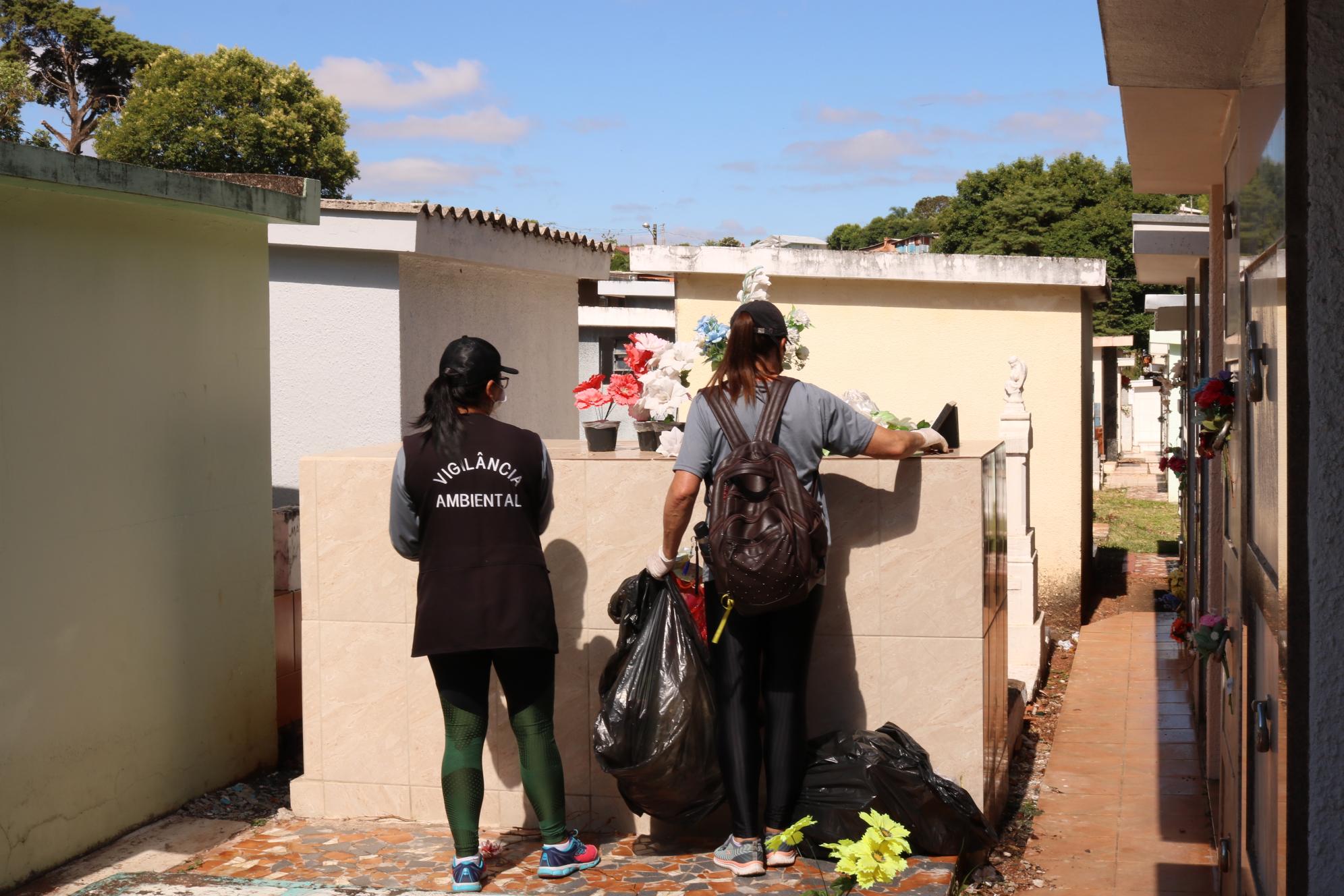 Na manhã desta sexta-feira (03), Agentes de Combate a Endemias e Agentes Comunitários de Saúde da Unidade Básica da Vila Jardim estiveram realizando vistoria no Cemitério Municipal João Paulo II. A ação programada pelas Agentes objetiva identificar e eliminar possíveis criadouros do mosquito Aedes aegypti, tendo em vista a movimentação de pessoas que aconteceu nos finados e as chuvas dos últimos dias. Durante o trabalho, as servidoras removeram os plásticos dos vasos de flores, eliminaram locais com água parada e coletaram amostras das larvas encontradas.