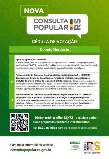 Acontece até a próxima quarta-feira (15), a votação da Consulta Popular, em que a população define diretamente parte dos investimentos que vão constar no orçamento do Estado do Rio Grande de Sul. Para este ano, o Conselho de Desenvolvimento Regional do Nordeste Riograndense (Corede Nordeste), de qual Sananduva faz parte, escolheu três demandas que estão na cédula de votação: