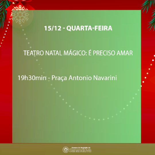 Você é nosso convidado para assistir ao teatro “Natal Mágico: É Preciso Amar”, nesta quarta-feira (15), às 19h30min, na Praça Antonio Navarini. O espetáculo teatral faz parte da programação do Natal 2021 - Renascimento e Esperança.