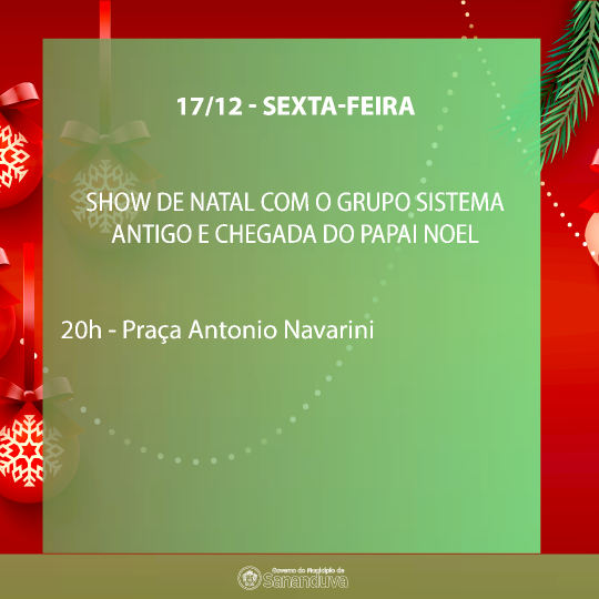 Você é nosso convidado para prestigiar o Show de Natal com o Grupo Sistema Antigo, na Praça Antonio Navarini, às 20h, desta sexta-feira (17). Também vai acontecer a chegada do Papai Noel e a distribuição de bombons às crianças.