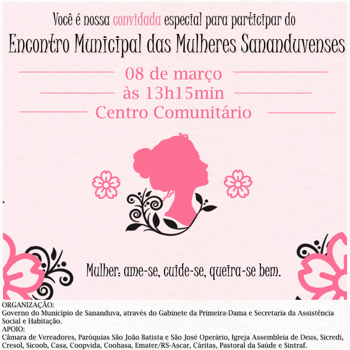 Com o tema “Mulher: ame-se, cuide-se, queira-se bem”, o Encontro Municipal das Mulheres Sananduvenses acontece na próxima terça-feira, dia 08 de março, a partir das 13h15min, no Centro Comunitário da Paróquia São João Batista.