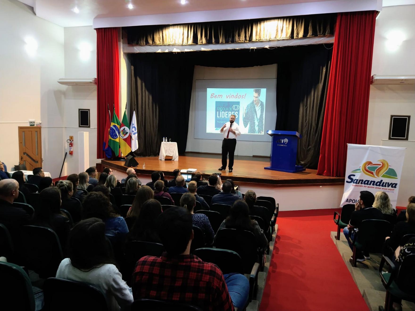 O prefeito Vermelho Pansera participou da abertura da Escola de Líderes promovida pela JCI Sananduva e que conta com o apoio do Governo do Município de Sananduva. O evento aconteceu na noite de quinta-feira (21), na Casa da Cultura Prefeito Hilário Copatti e também contou com a presença da secretária da Educação, Cultura e Desportos, Luciana Crestani, do secretário do Planejamento e Desenvolvimento Econômico, Rodrigo Getelina, da presidente da Câmara de Vereadores, Caroline Brezolin, da presidente da JCI Sananduva, Nilva Correa de Quadros, de integrantes da JCI e alunos inscritos na Escola. Os presentes acompanharam a palestra inaugural com Damião Battisti, que falou sobre liderança.
