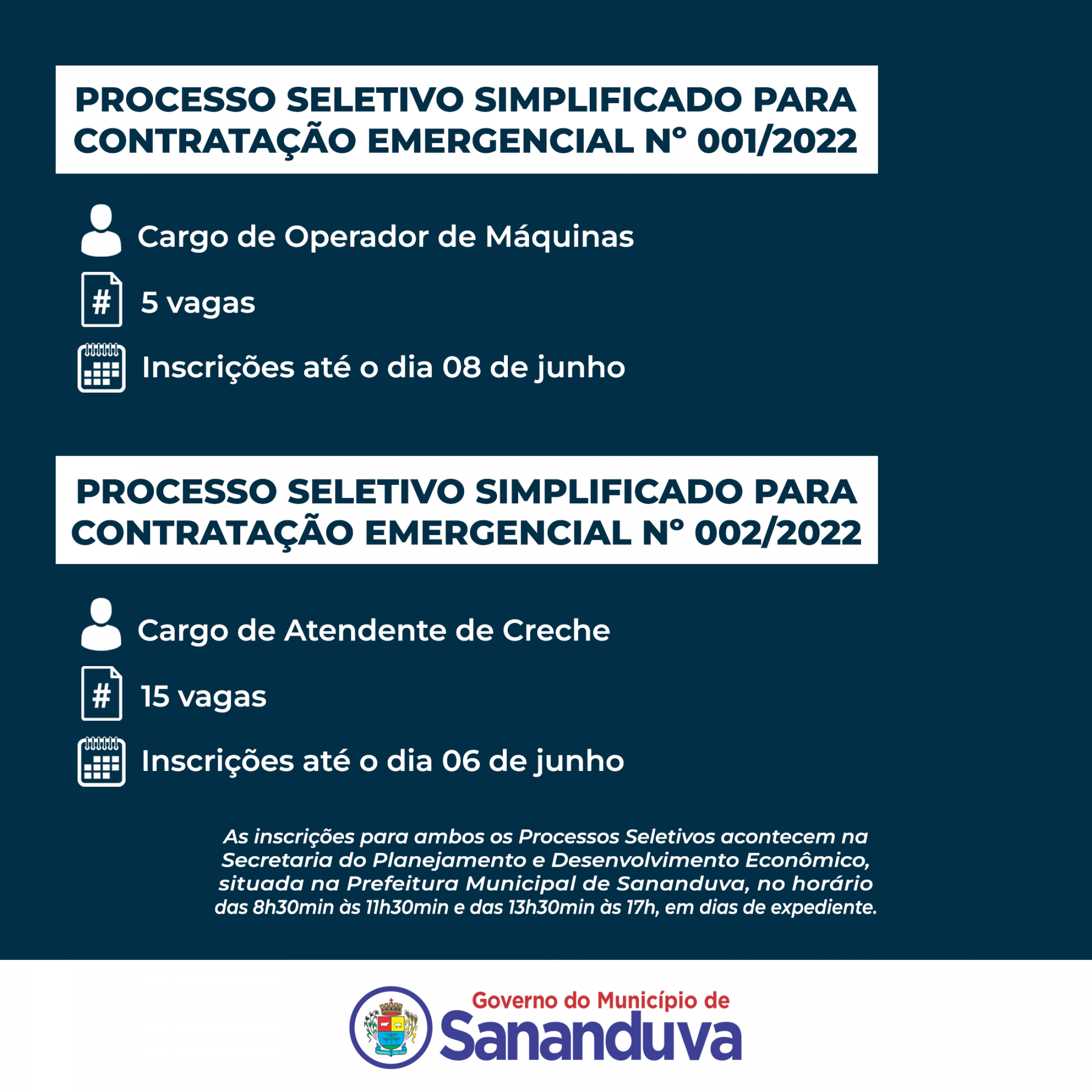 O Governo do Município de Sananduva publicou editais de processos seletivos que visam a contratação de pessoal para suprir necessidades administrativas da Secretaria da Infraestrutura Rural, Agricultura e Meio Ambiente, Secretaria da Infraestrutura Urbana e Secretaria da Educação, Cultura e Desportos.