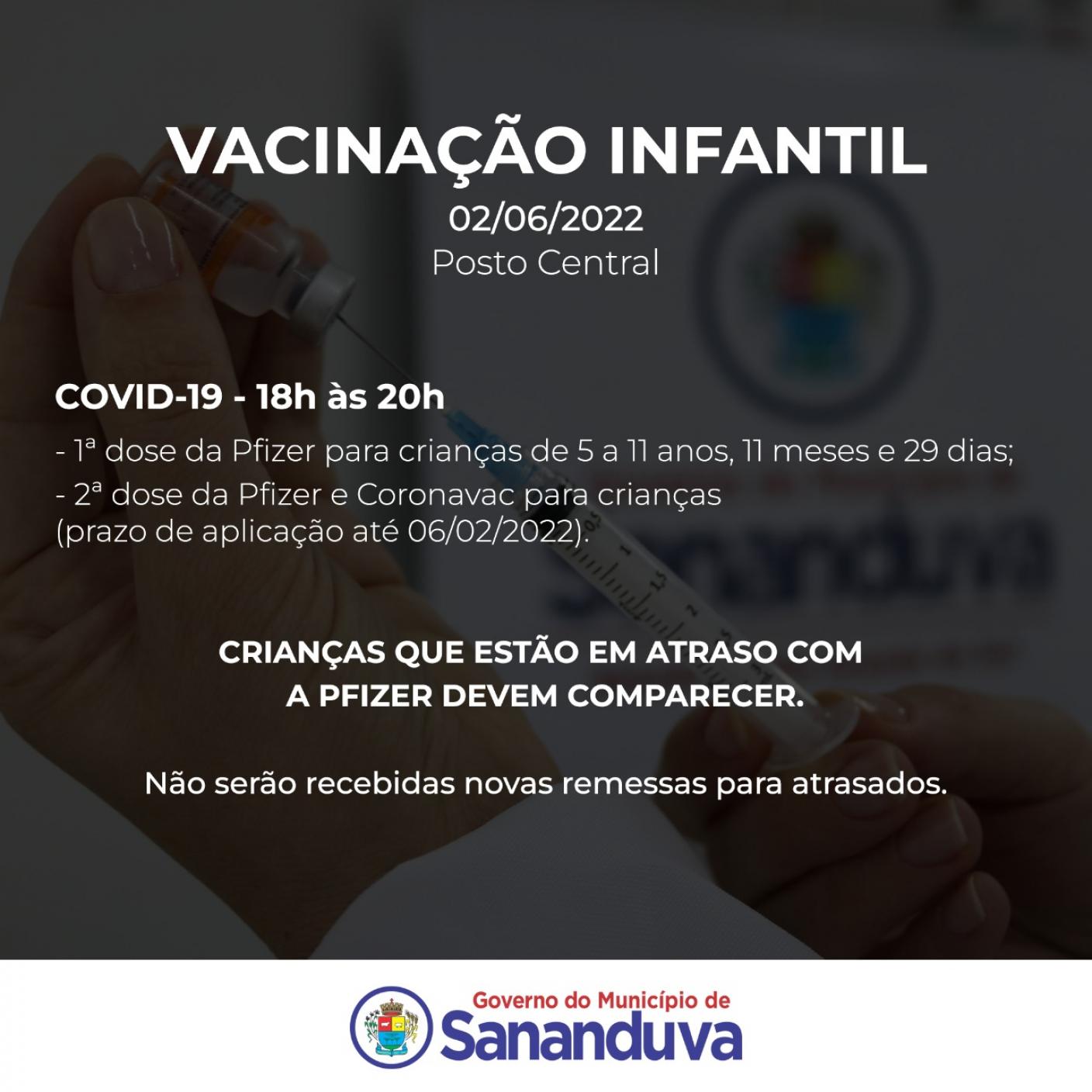 Nesta quinta-feira (02), a Secretaria da Saúde promove a vacinação infantil contra a Covid-19, no Posto Central, das 18h às 20h, conforme cronograma: