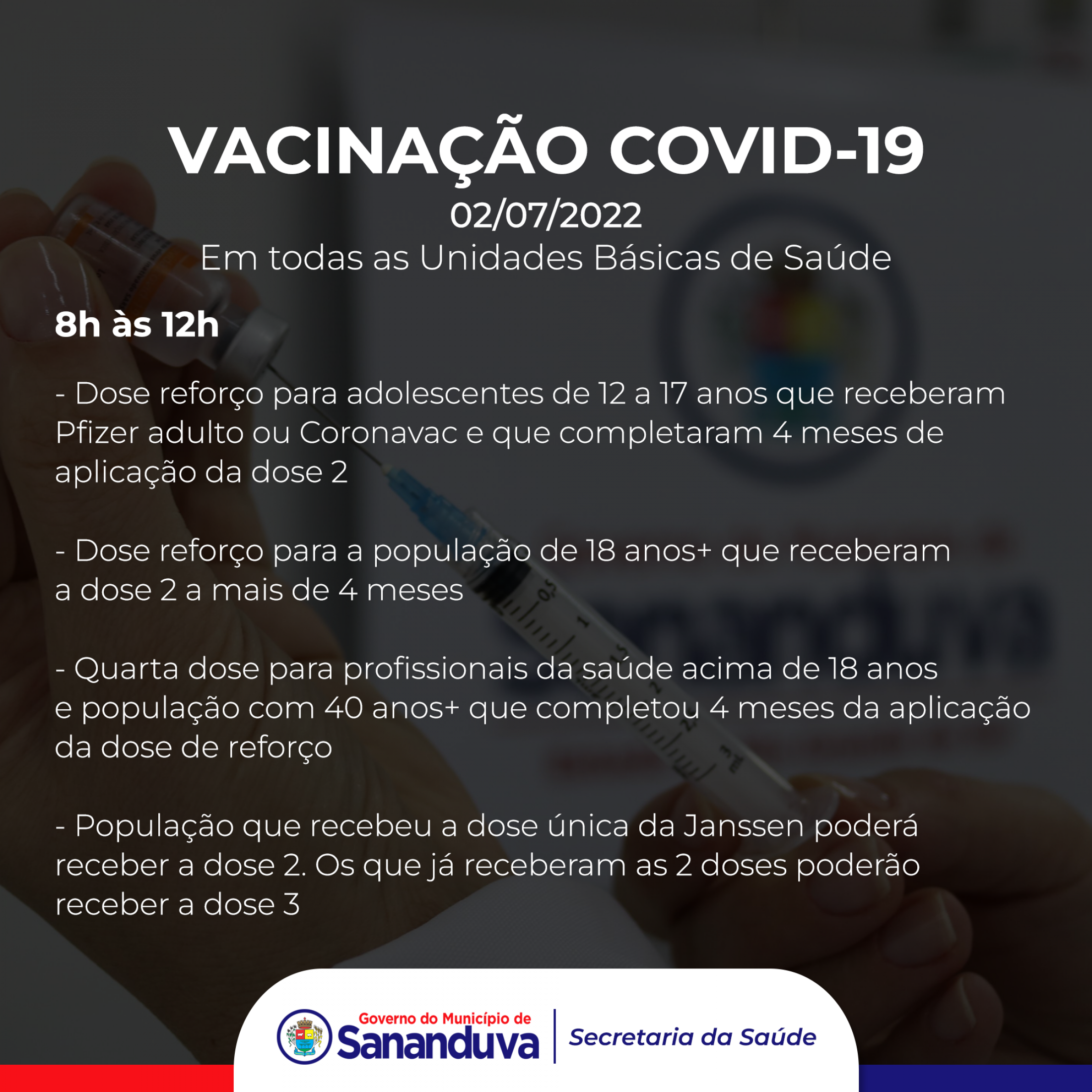 - Dose reforço para adolescentes de 12 a 17 anos que receberam Pfizer adulto ou Coronavac e que completaram 4 meses de aplicação da dose 2;