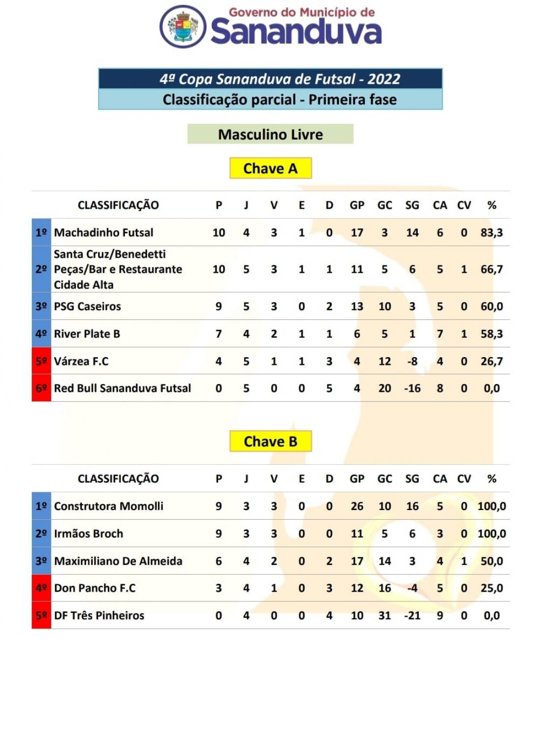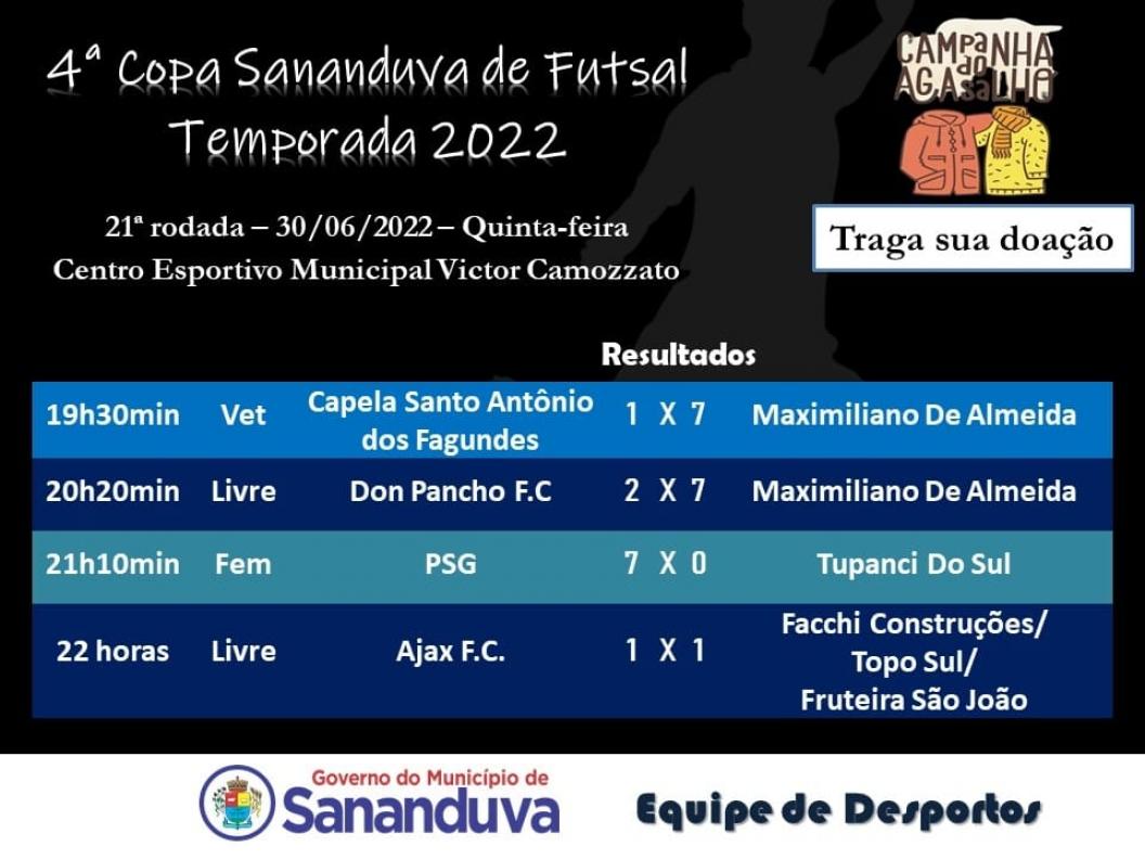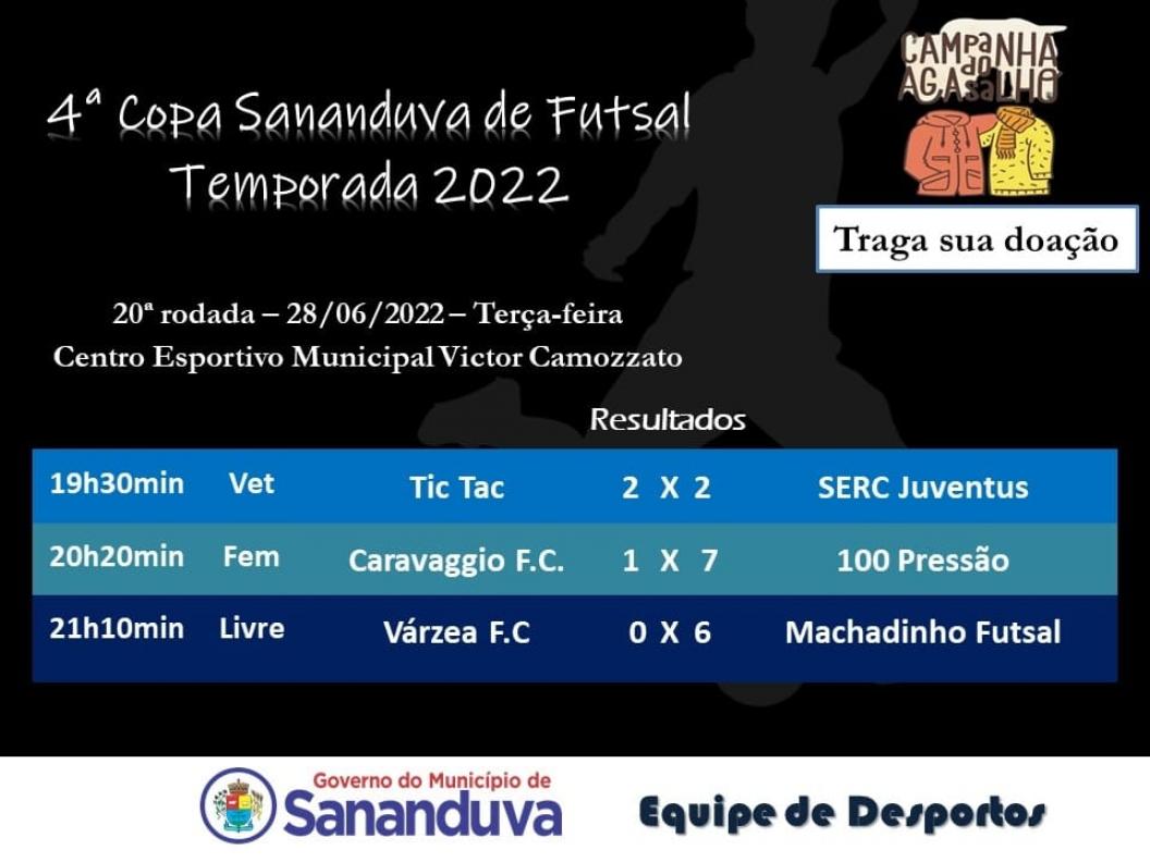 Na última semana findou mais uma rodada de jogos da 4ª Copa Sananduva de Futsal. Os jogos acontecem sempre nas terças e quintas com início às 19h30min, e nas sextas com início às 20h, no Centro Esportivo Municipal Victor Camozzato. A entrada ao ginásio para acompanhar aos jogos é gratuita.