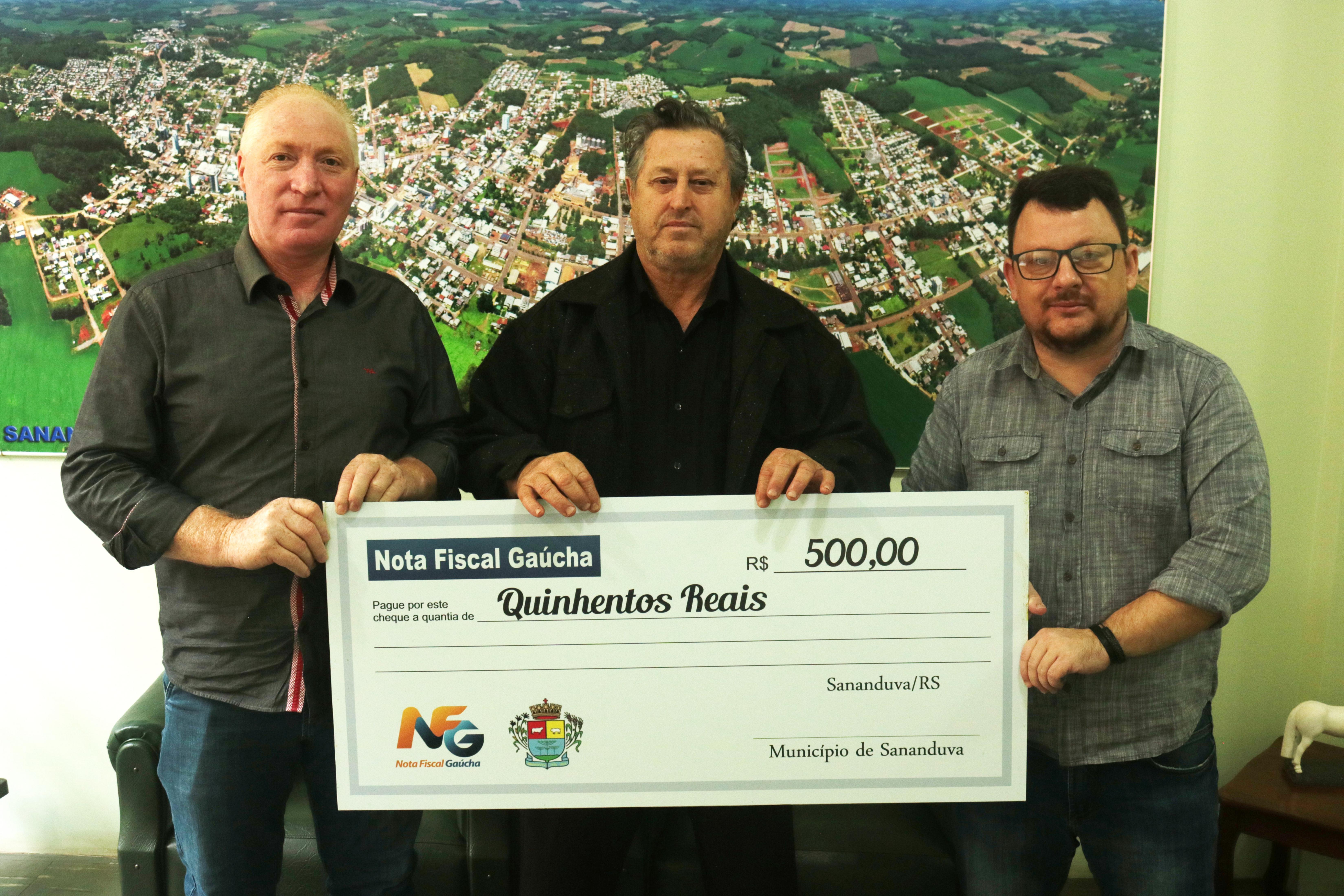 Na manhã desta segunda-feira (11) foi realizada mais uma entrega de premiação do Programa Nota Fiscal Gaúcha. A entrega aconteceu na Prefeitura Municipal de Sananduva, com a presença do prefeito Vermelho Pansera, do secretário do Planejamento e Desenvolvimento Econômico, Rodrigo Getelina e do contemplado da vez, Zigomar Fagundes da Luz.