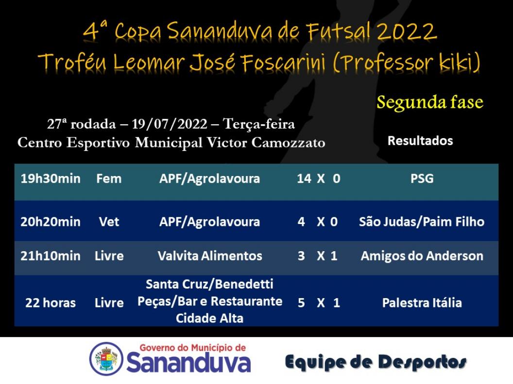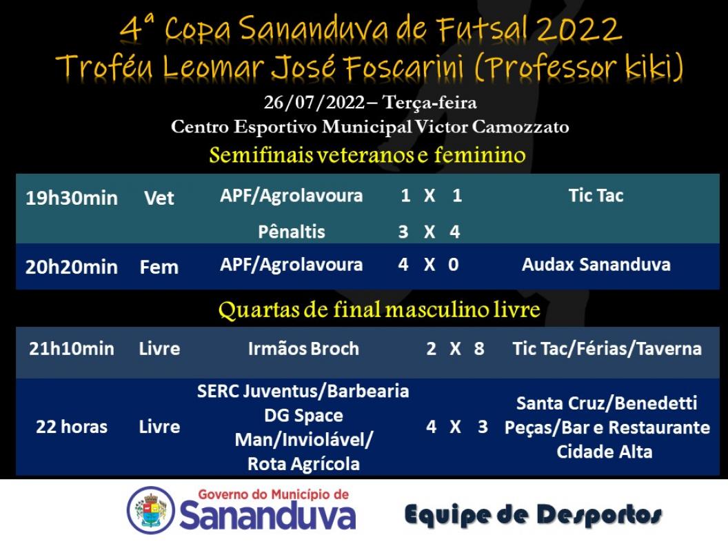 Na última semana aconteceram os jogos que definiram as finais da 4ª Copa Sananduva de Futsal. As categorias masculino livre, feminino e veteranos entram em quadra na próxima sexta-feira na briga pelo título.
