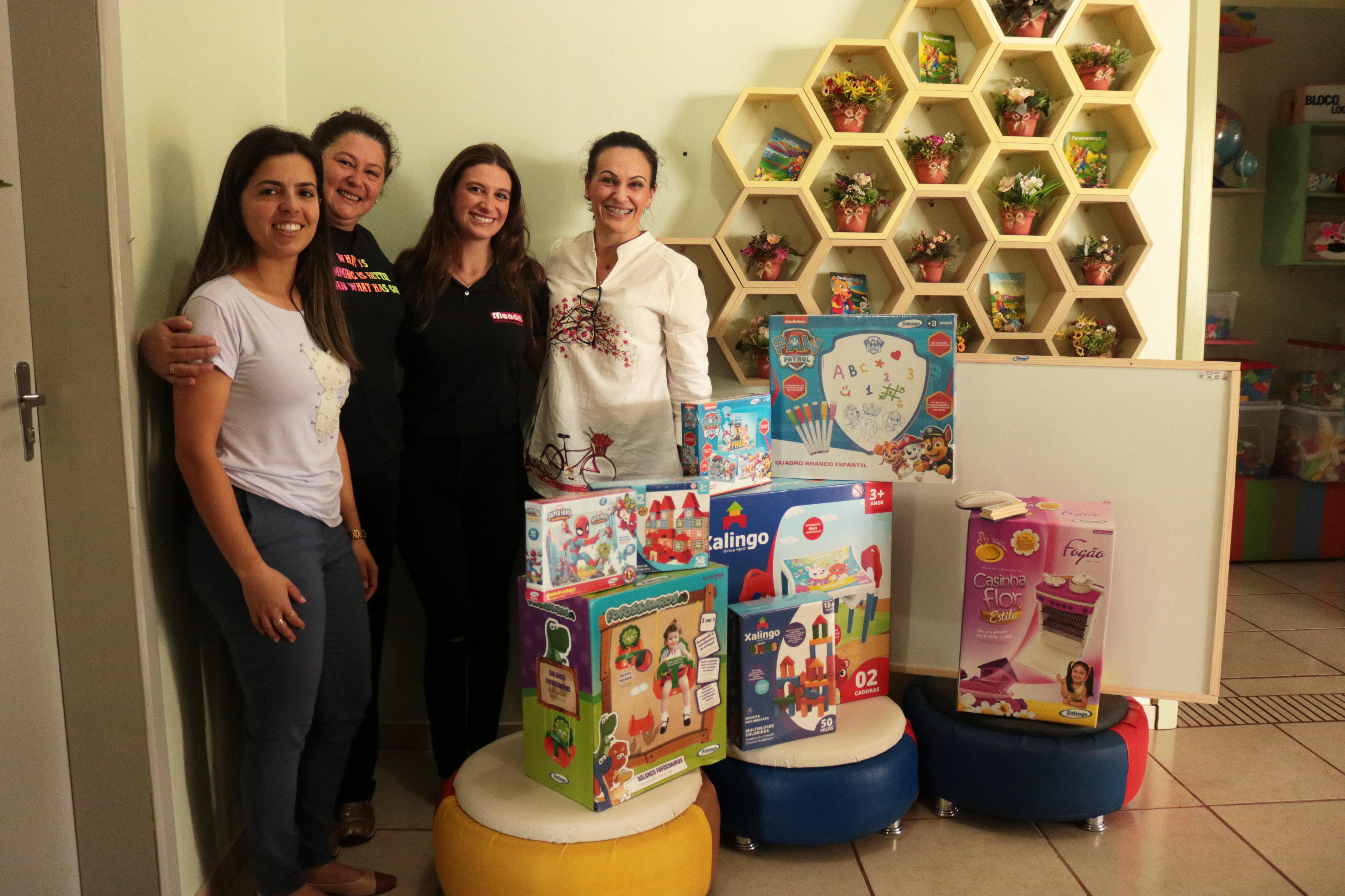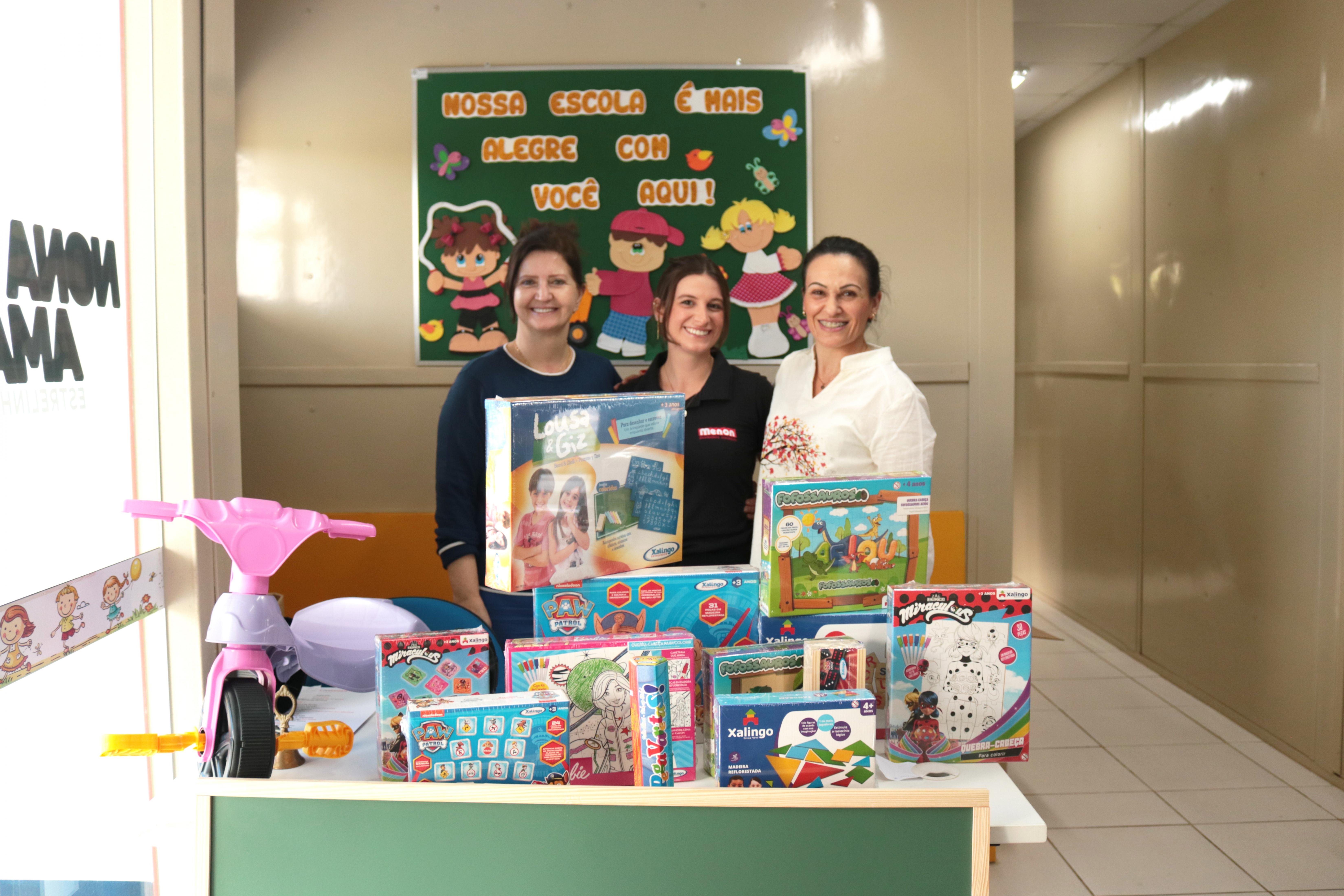 Participaram da entrega a Secretária da Educação, Luciana Crestani, e Paula Menon, representante da Menon Atacadista, empresa responsável pela doação dos brinquedos.