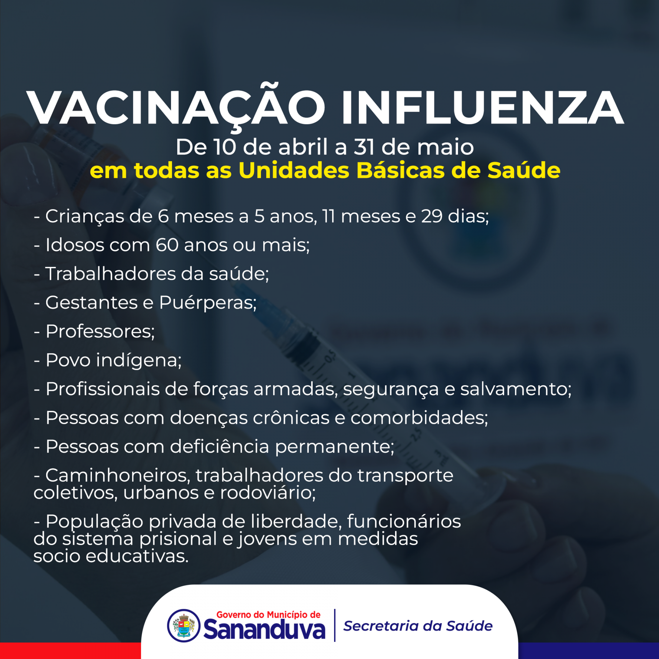O Ministério da Saúde realizará a 25ª Campanha Nacional de Vacinação contra a Influenza no período de 10 de abril a 31 de maio de 2023. A campanha inicia nesta segunda-feira (10) em todas as Unidades de Saúde.