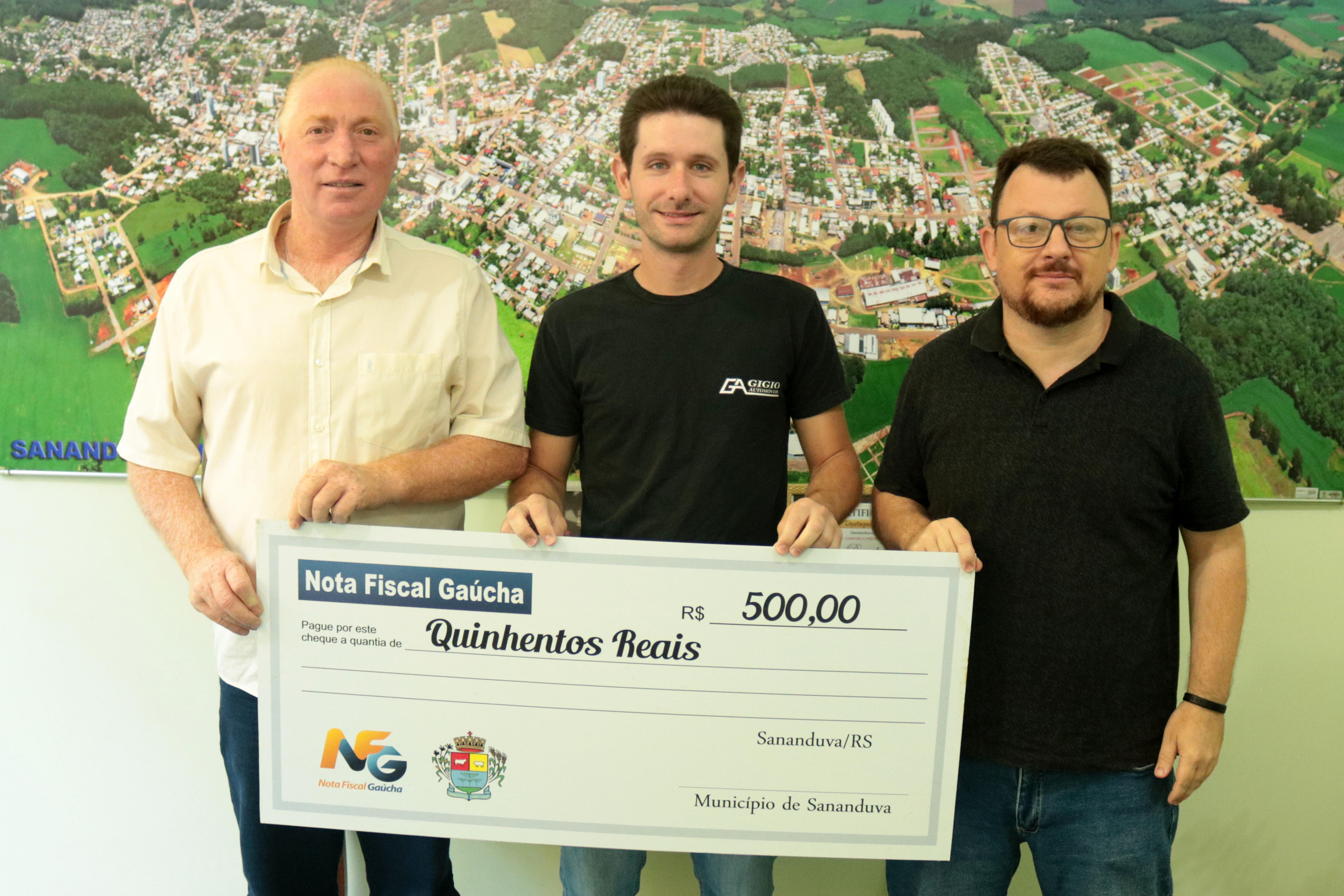 Na manhã desta segunda-feira (10) foi realizada mais uma entrega da premiação do Programa Nota Fiscal Gaúcha. A entrega aconteceu na Prefeitura Municipal de Sananduva, com a presença do prefeito Vermelho Pansera, do secretário do Planejamento e Desenvolvimento Econômico Rodrigo Getelina e do contemplado Roberto Luiz Felini Junior, residente em Tapejara.
