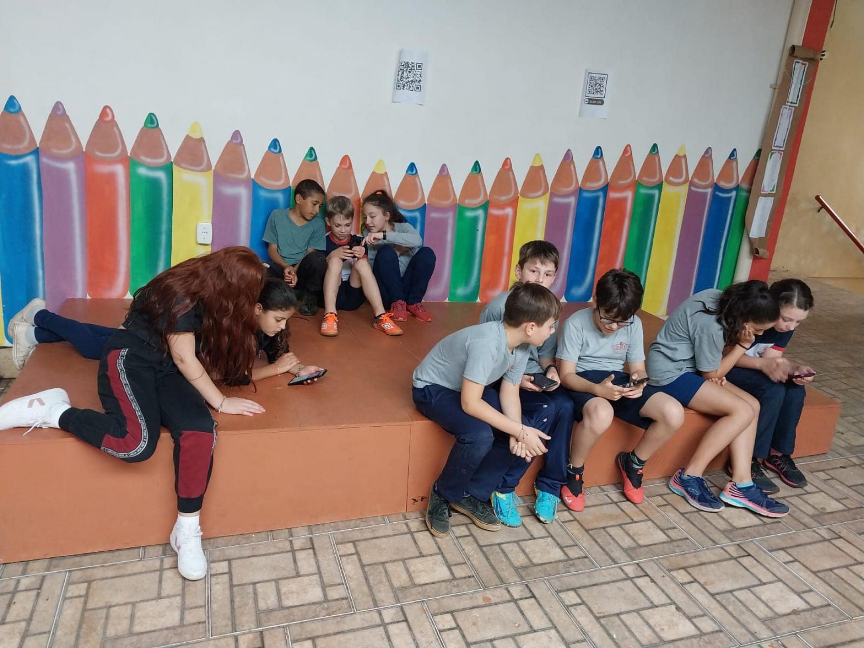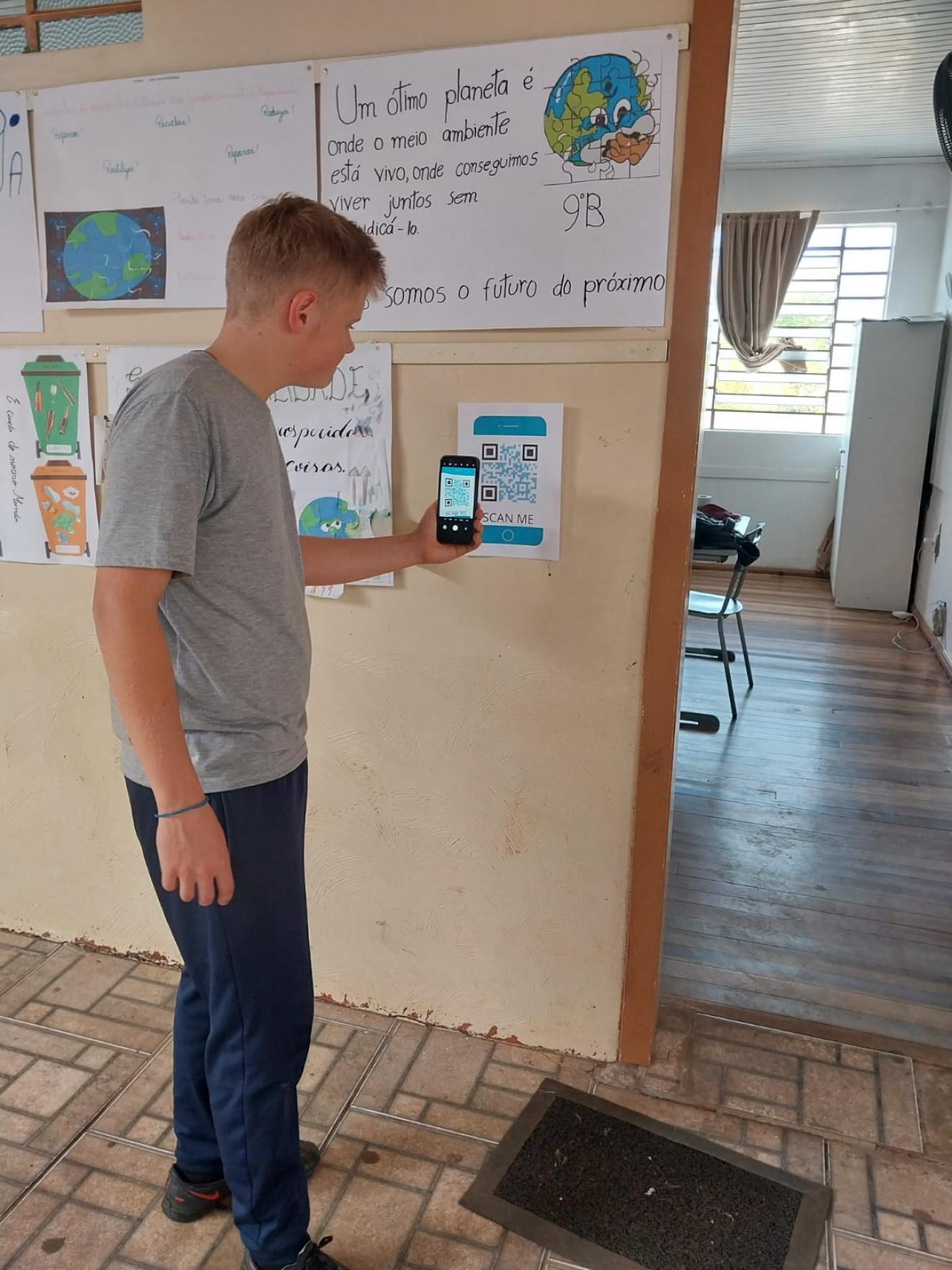 Outra atividade interessante foi a utilização de QR code espalhados pela escola. Os estudantes do 5º ao 9º ano utilizaram seus aparelhos celulares para fazer a leitura dos códigos, que continham jogos sobre sustentabilidade, vídeos curtos de conscientização, imagens e práticas sustentáveis. Essa abordagem tecnológica envolvente permitiu que os alunos aprendessem de forma interativa e divertida, explorando diferentes aspectos da sustentabilidade.