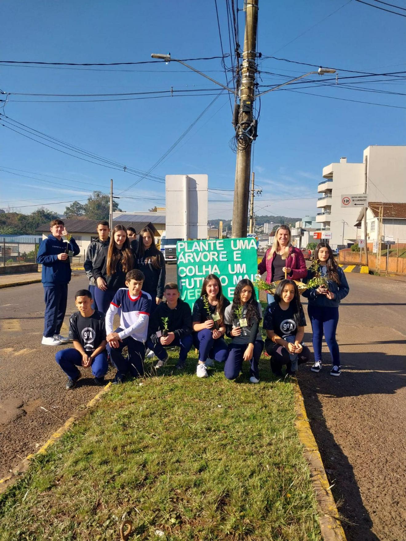 Os alunos do 9º ano realizaram um pedágio consciente, em que distribuíram mudas frutíferas para conscientizar a comunidade sobre a importância da arborização urbana e do consumo de alimentos saudáveis. Essa iniciativa não apenas contribui para a conscientização ambiental, mas também promove uma maior conexão entre os estudantes e a comunidade ao redor da escola.