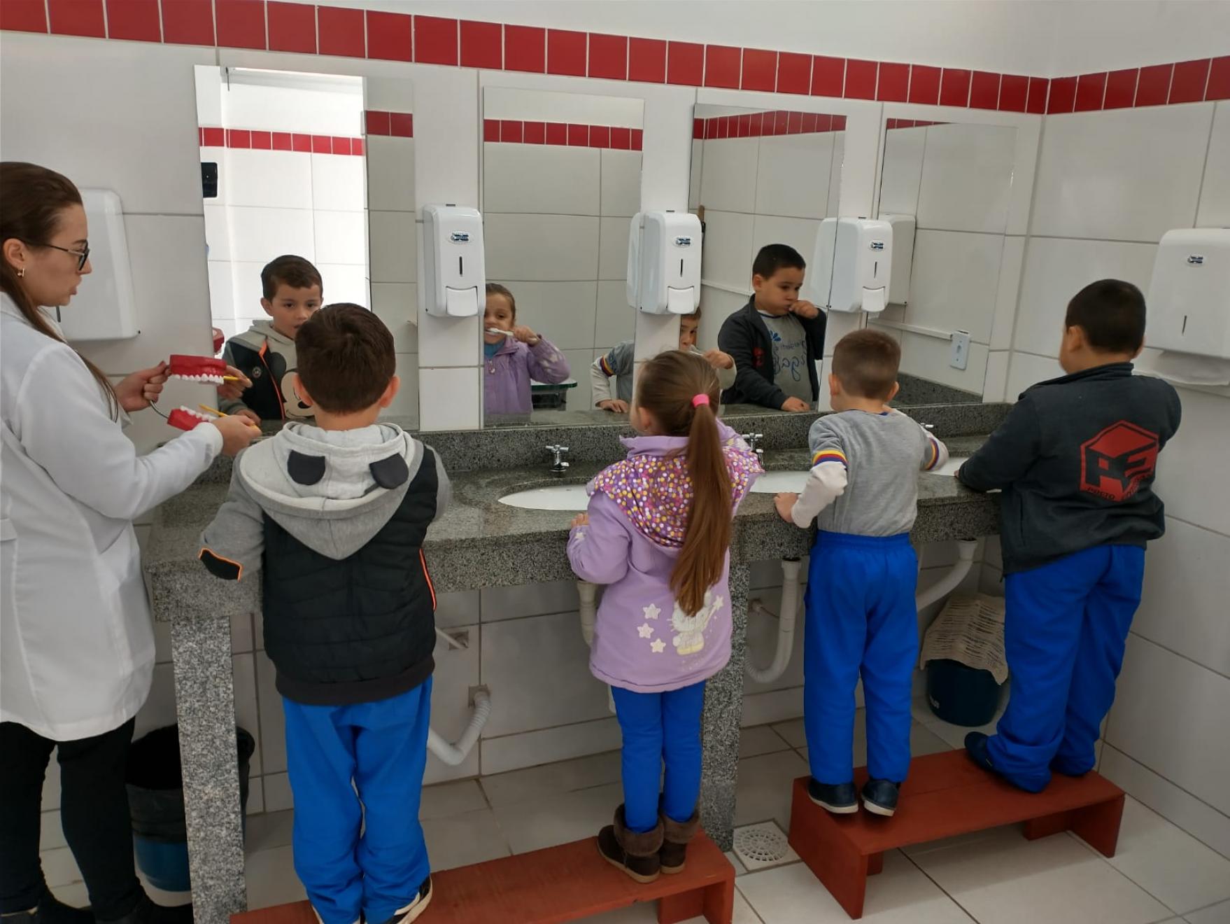 Outras atividades também foram realizadas pela UBS Dr.ª Eunice Morales Kaross, do Bairro Silos. Os profissionais da nutrição, da enfermagem, da psicologia e da educação física estiveram com os alunos da E.M.E.F. Oreste Agostinetto. Já os alunos da E.M.E.I. Nona Amábile realizam escovação supervisionada com profissional da odontologia.