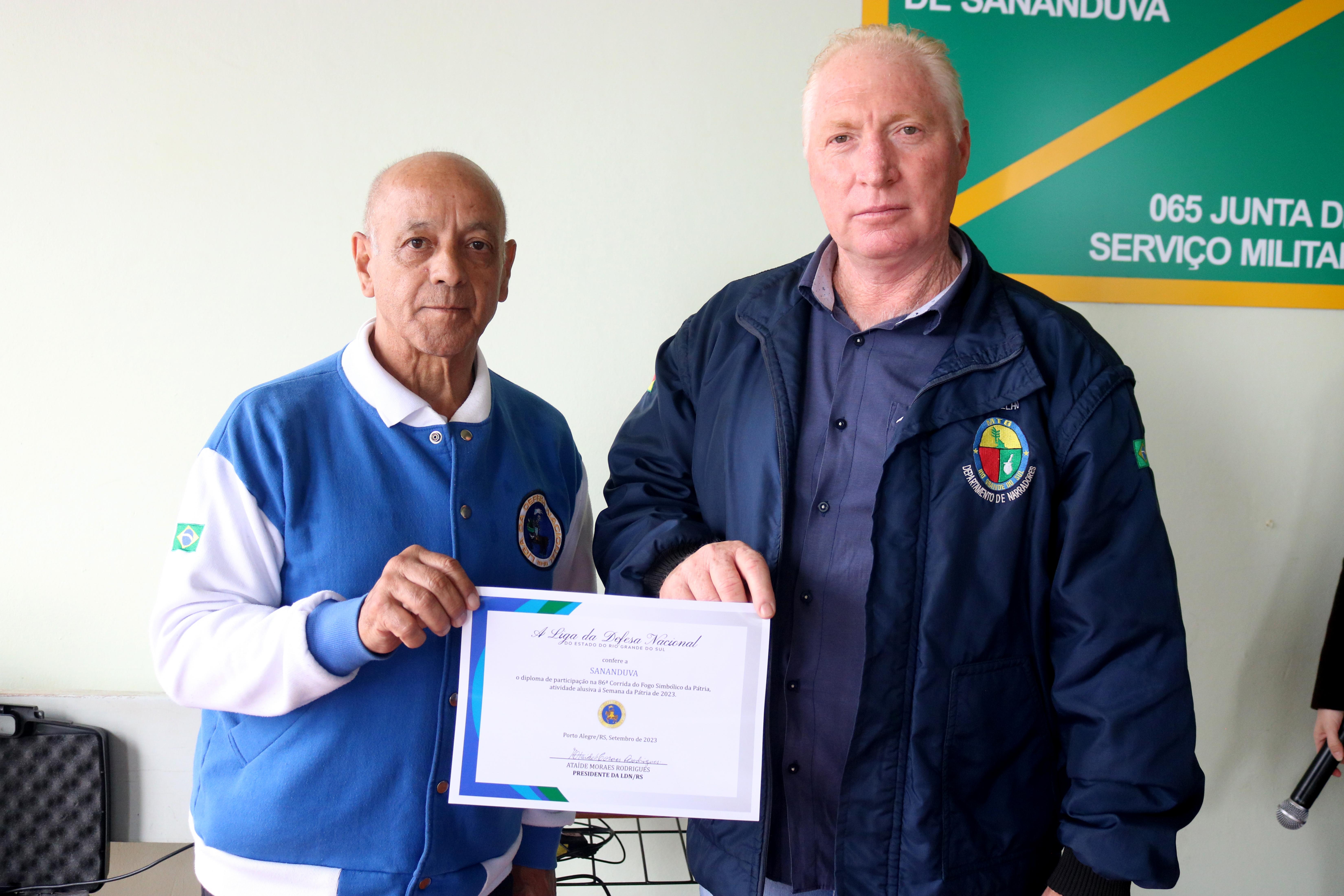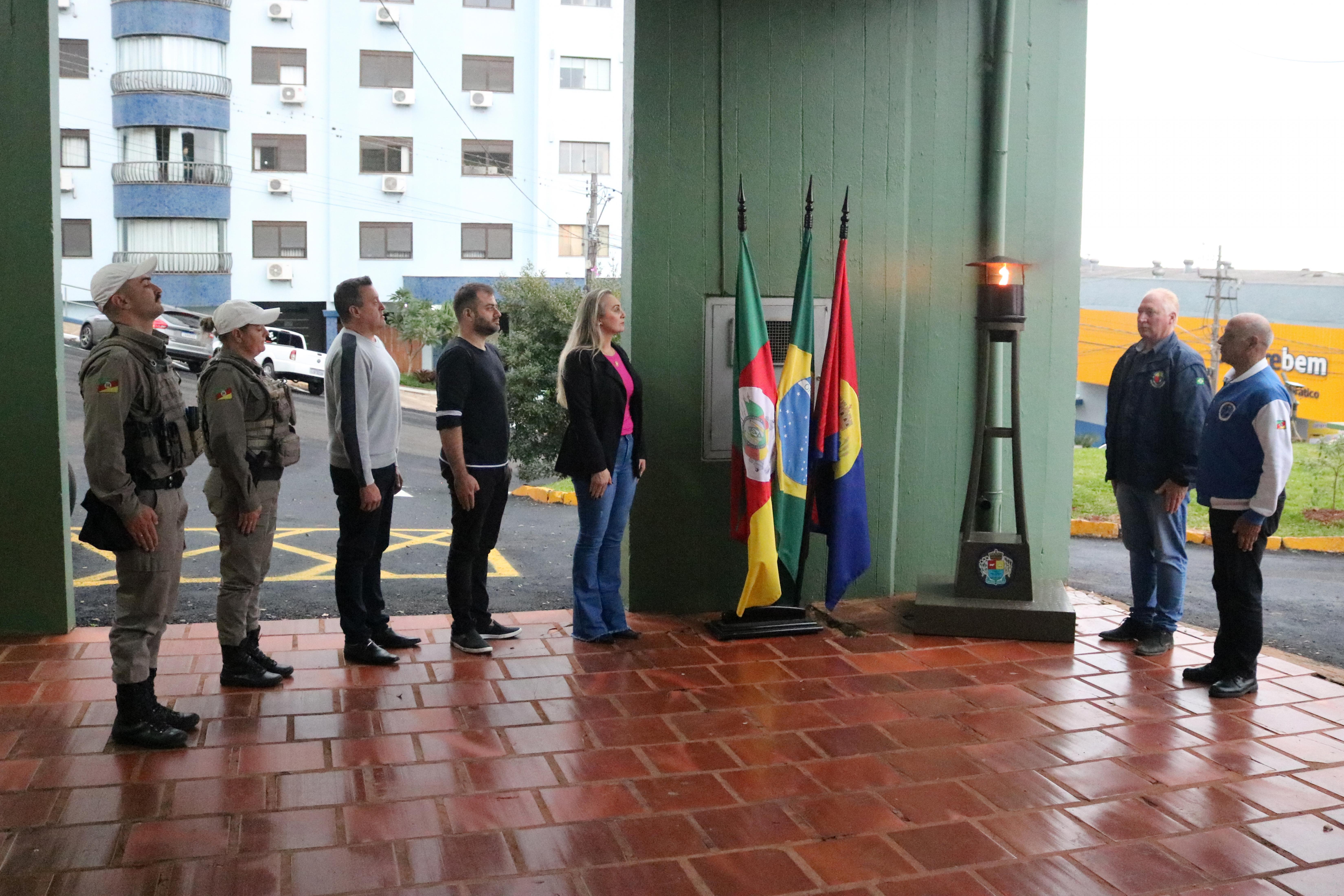 O prefeito Vermelho Pansera recebeu das mãos do Coronel Ataíde Moraes Rodrigues, presidente da Liga da Defesa Nacional do Rio Grande do Sul, o Fogo Simbólico e procedeu com o acendimento da Pira. “Sabemos do simbolismo desta chama e destacamos a importância dela para demonstrar o pertencimento de todos na sociedade. Agradeço a Liga da Defesa Nacional por mais uma vez estar presente no nosso Município”, destacou o prefeito.