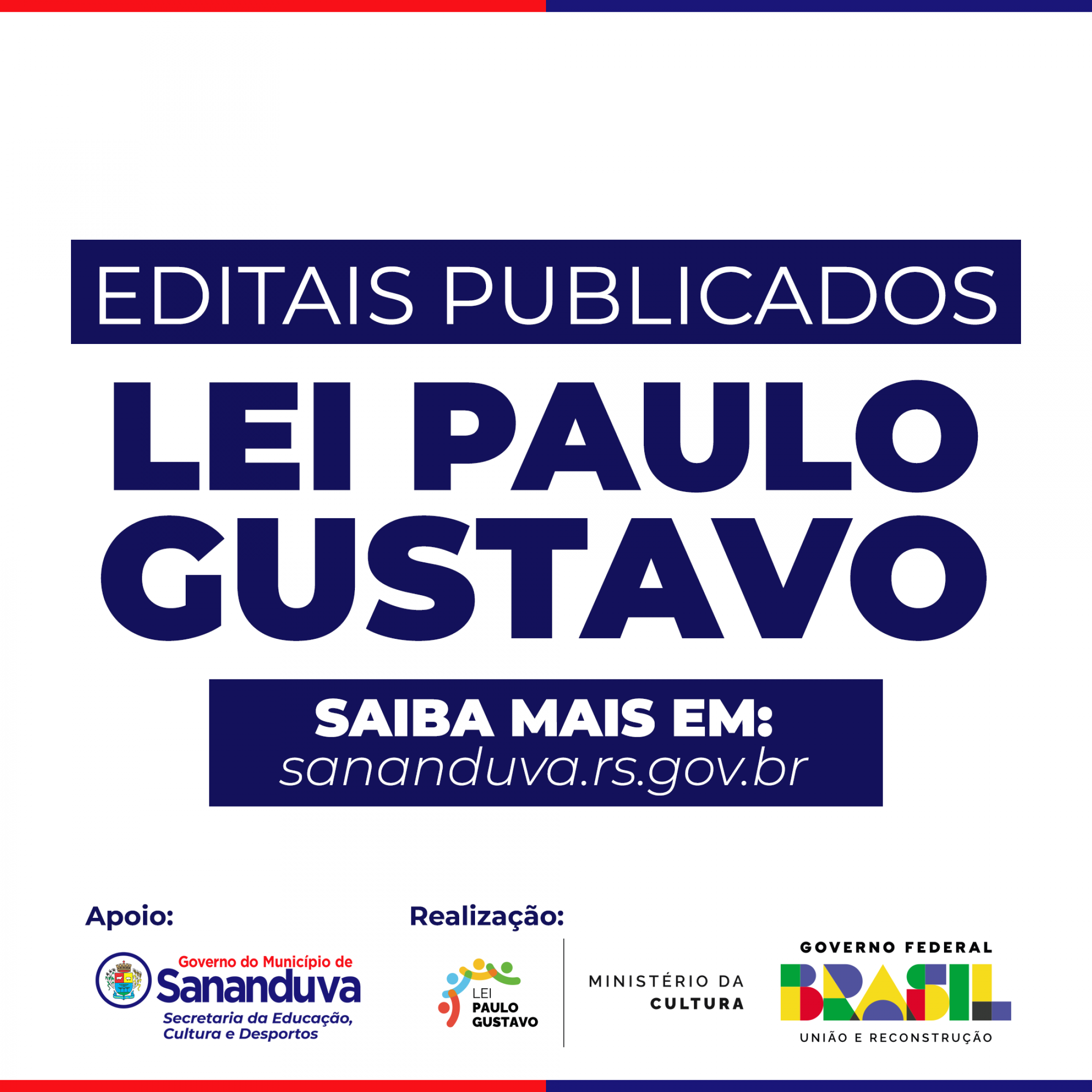 O Governo do Município de Sananduva publicou três editais da Lei Paulo Gustavo, que visa a seleção de projetos na área da Cultura, com prazo para inscrição do dia 21 de setembro até às 17h do dia 03 de outubro.