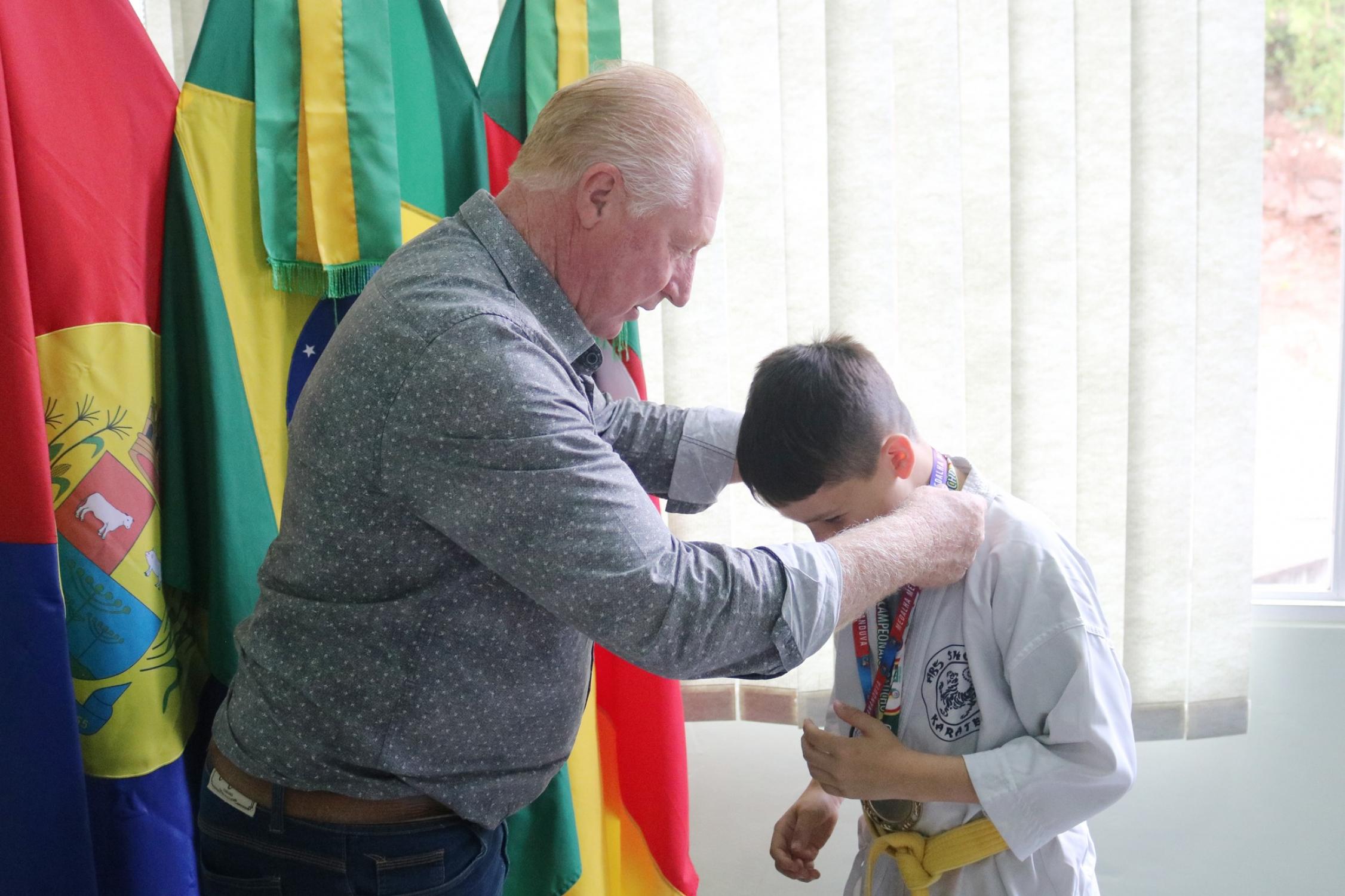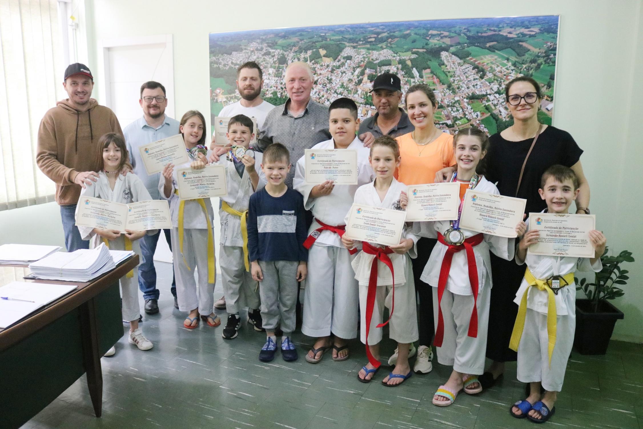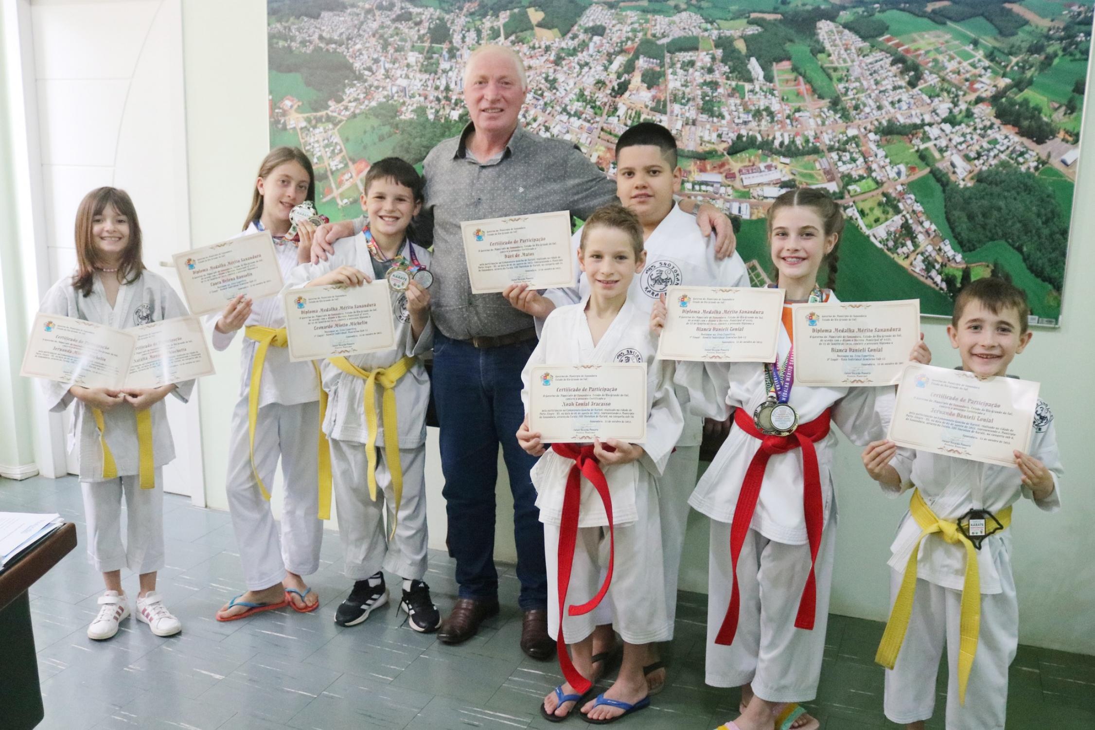 Na presença dos pais, competidores, professor e de autoridades municipais, o prefeito Vermelho Pansera realizou a entrega da Medalha Mérito Sananduva e dos certificados de participação aos representantes sananduvenses que estiveram competindo no Campeonato Gaúcho de Karatê, realizado no dia 05 de agosto, na cidade de Porto Alegre.