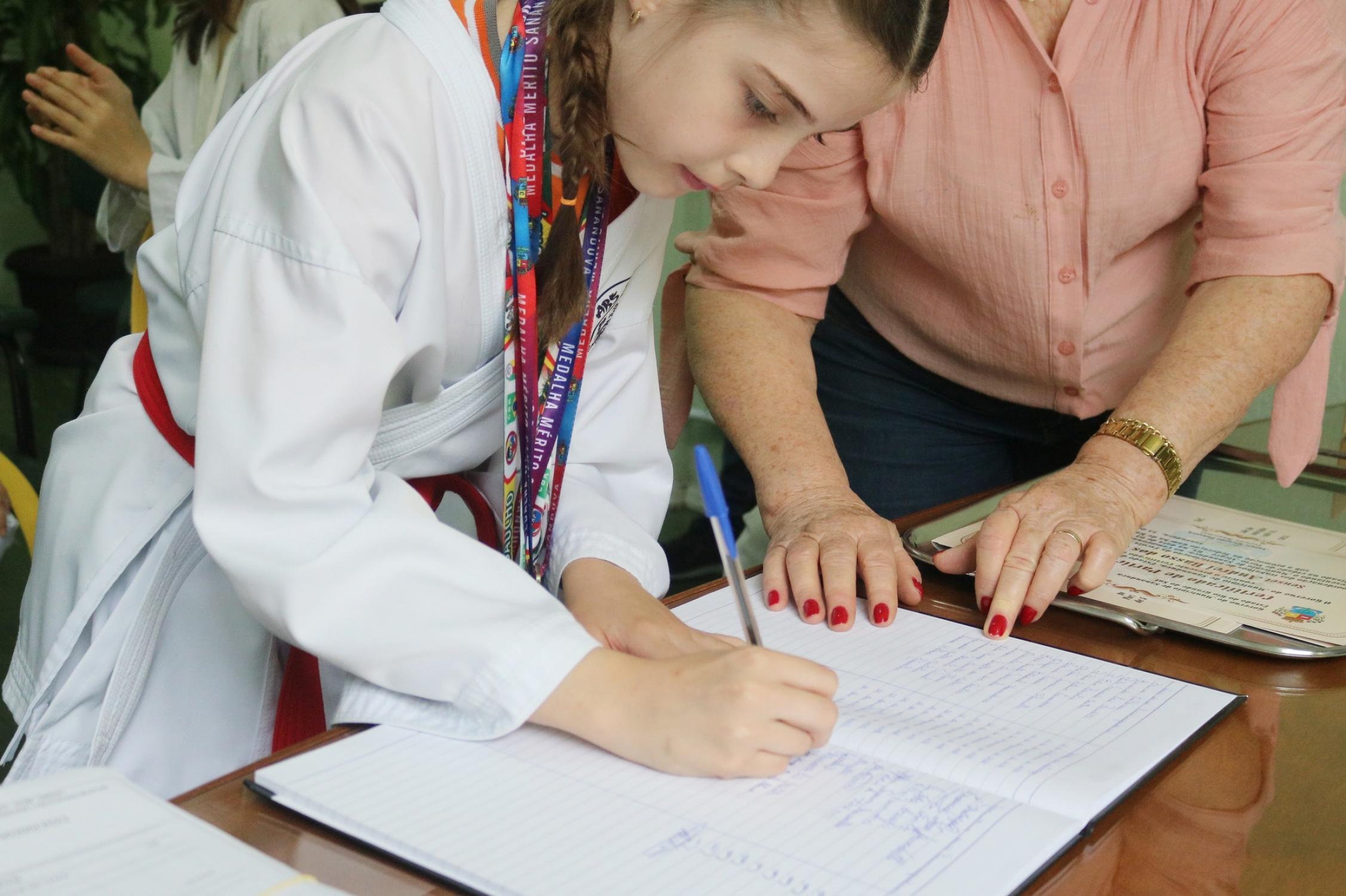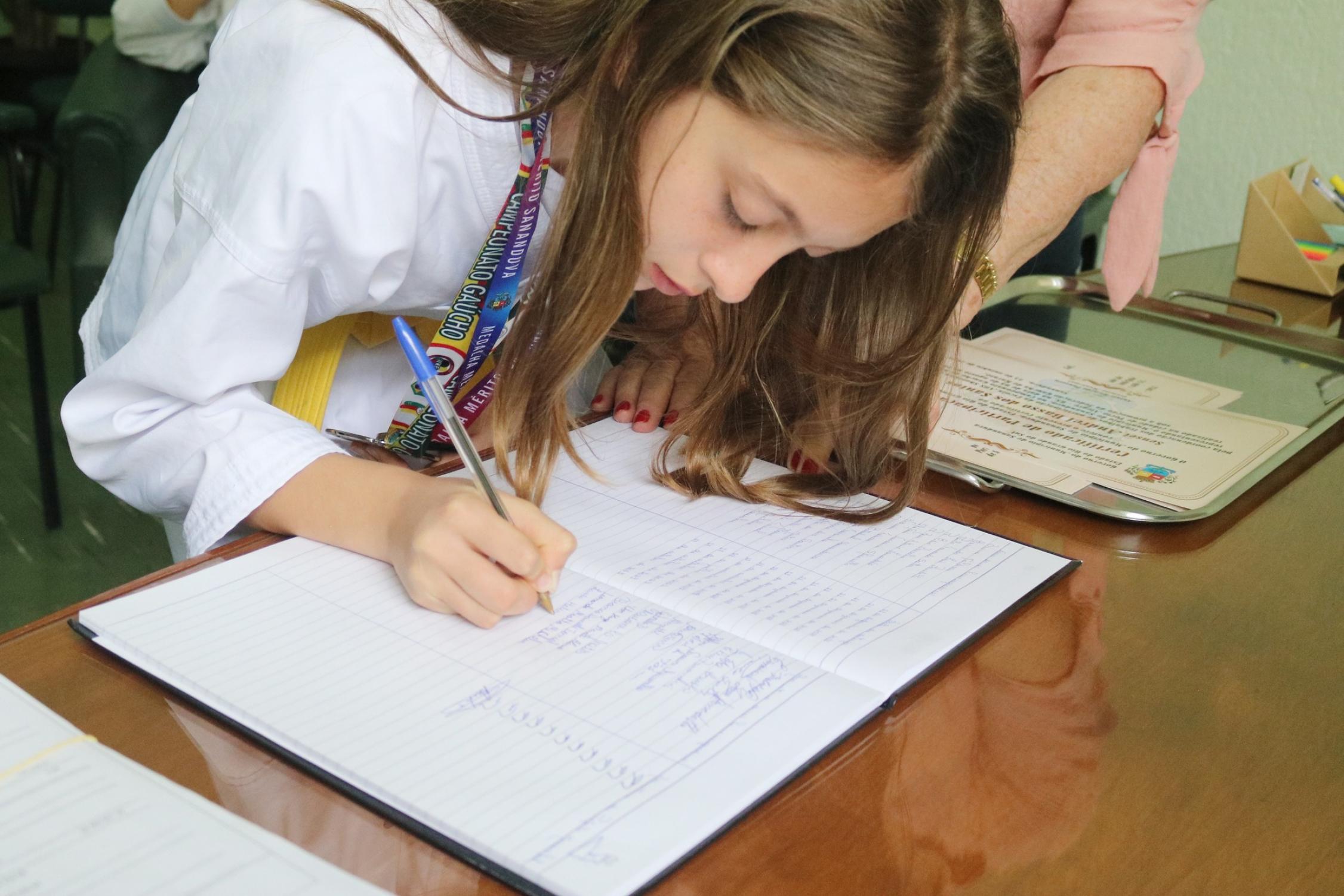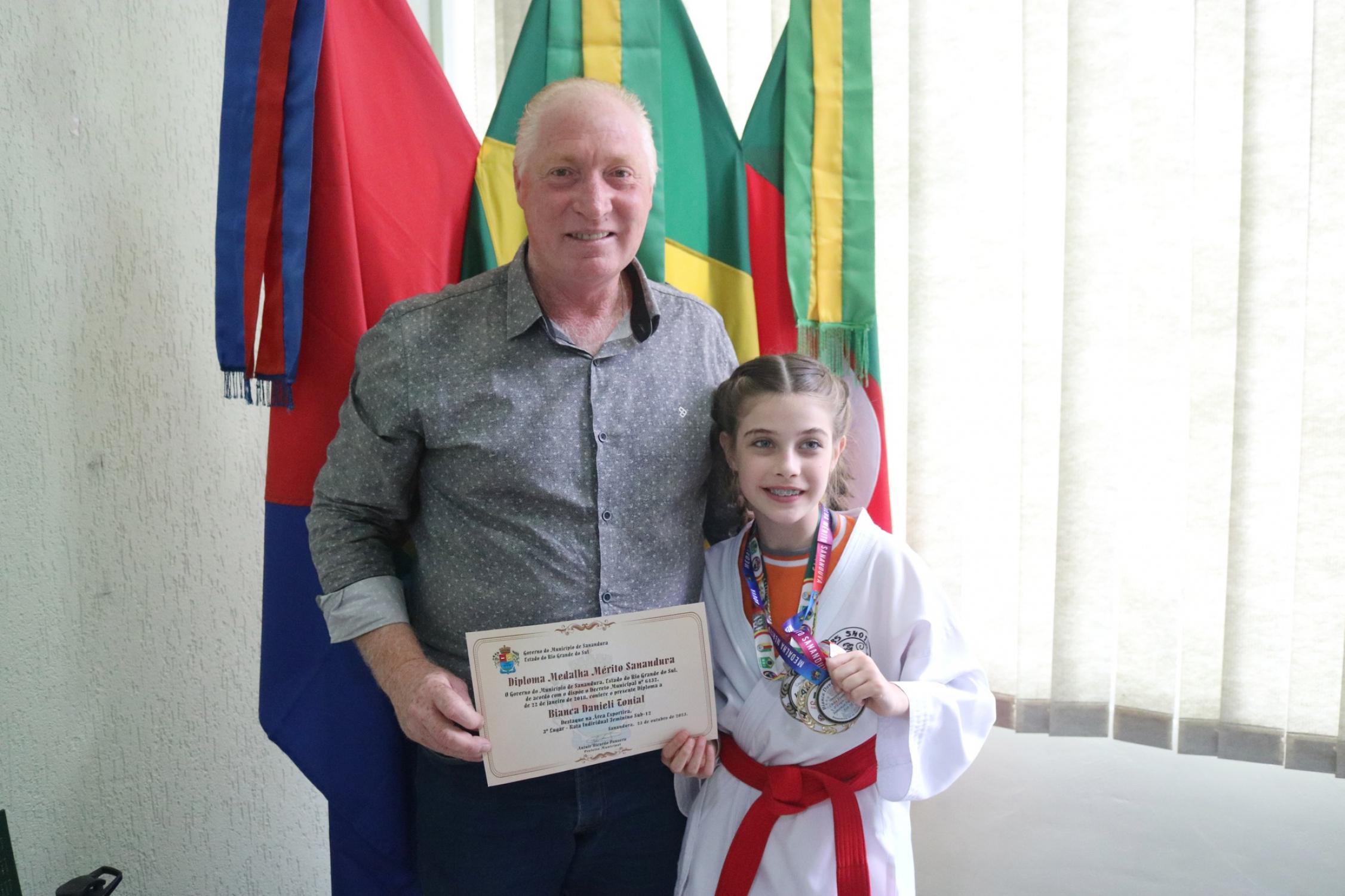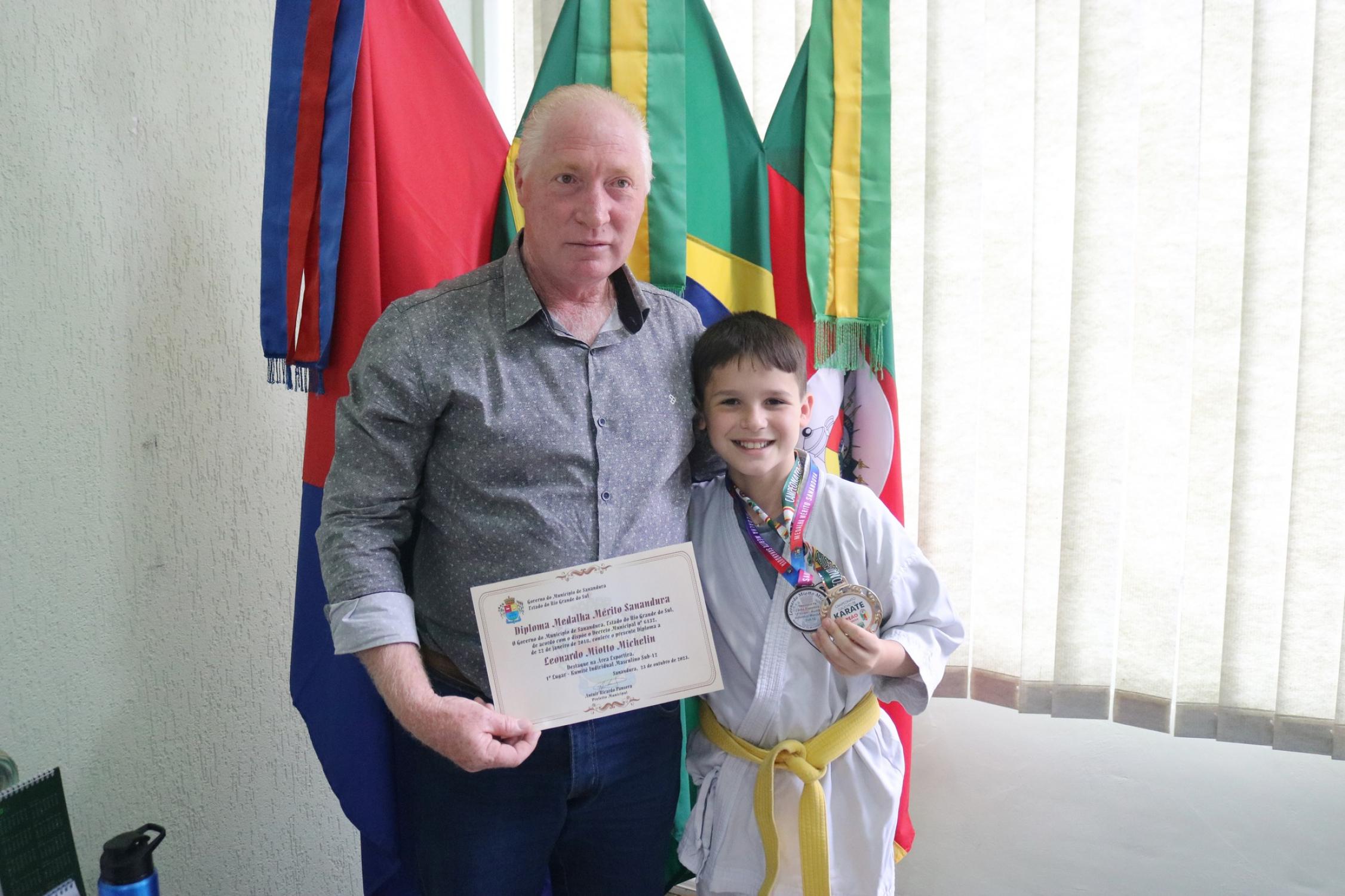Na presença dos pais, competidores, professor e de autoridades municipais, o prefeito Vermelho Pansera realizou a entrega da Medalha Mérito Sananduva e dos certificados de participação aos representantes sananduvenses que estiveram competindo no Campeonato Gaúcho de Karatê, realizado no dia 05 de agosto, na cidade de Porto Alegre.