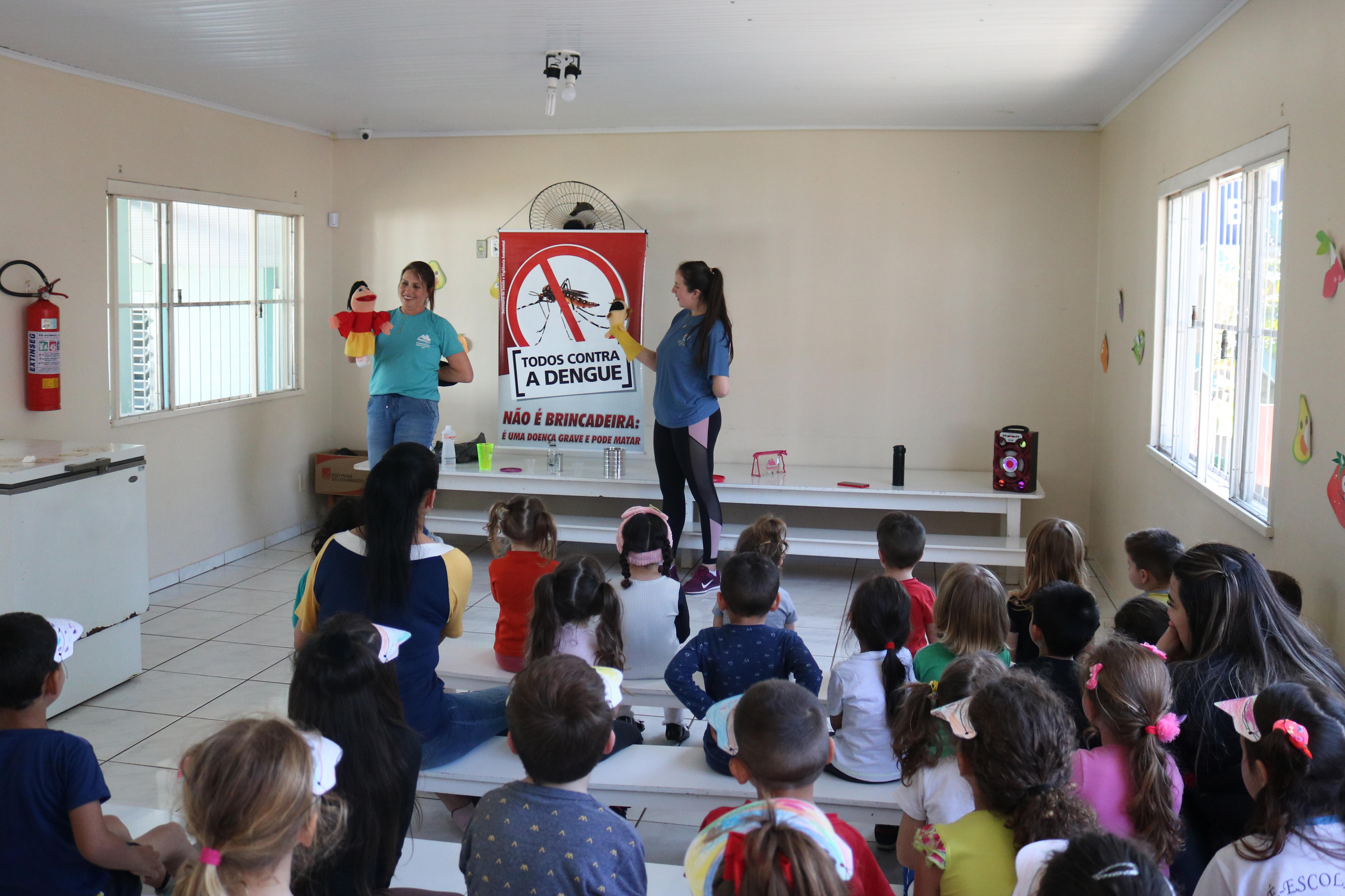 A fim de orientar as crianças de forma lúdica e interativa sobre a prevenção da dengue e do combate ao mosquito transmissor da doença, as agentes de combate a endemias estiveram realizando o trabalho orientativo nas E.M.E.I Tia Salete, Tia Noêmia e Nona Amábile e na E.M.E.F. Oreste Agostinetto.