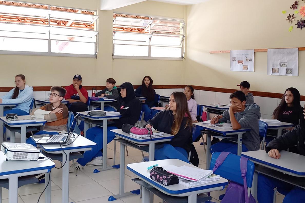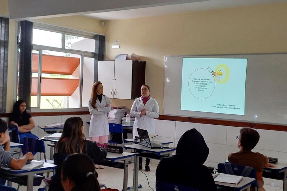 Outra ação foi realizada pela UBS São Cristóvão com os alunos do 8º ano da E.M.E.F. Gentil Antonio Tonial. As profissionais da Unidade abordaram a temática da sexualidade com os estudantes e falaram sobre os cuidados, doenças e métodos contraceptivos.