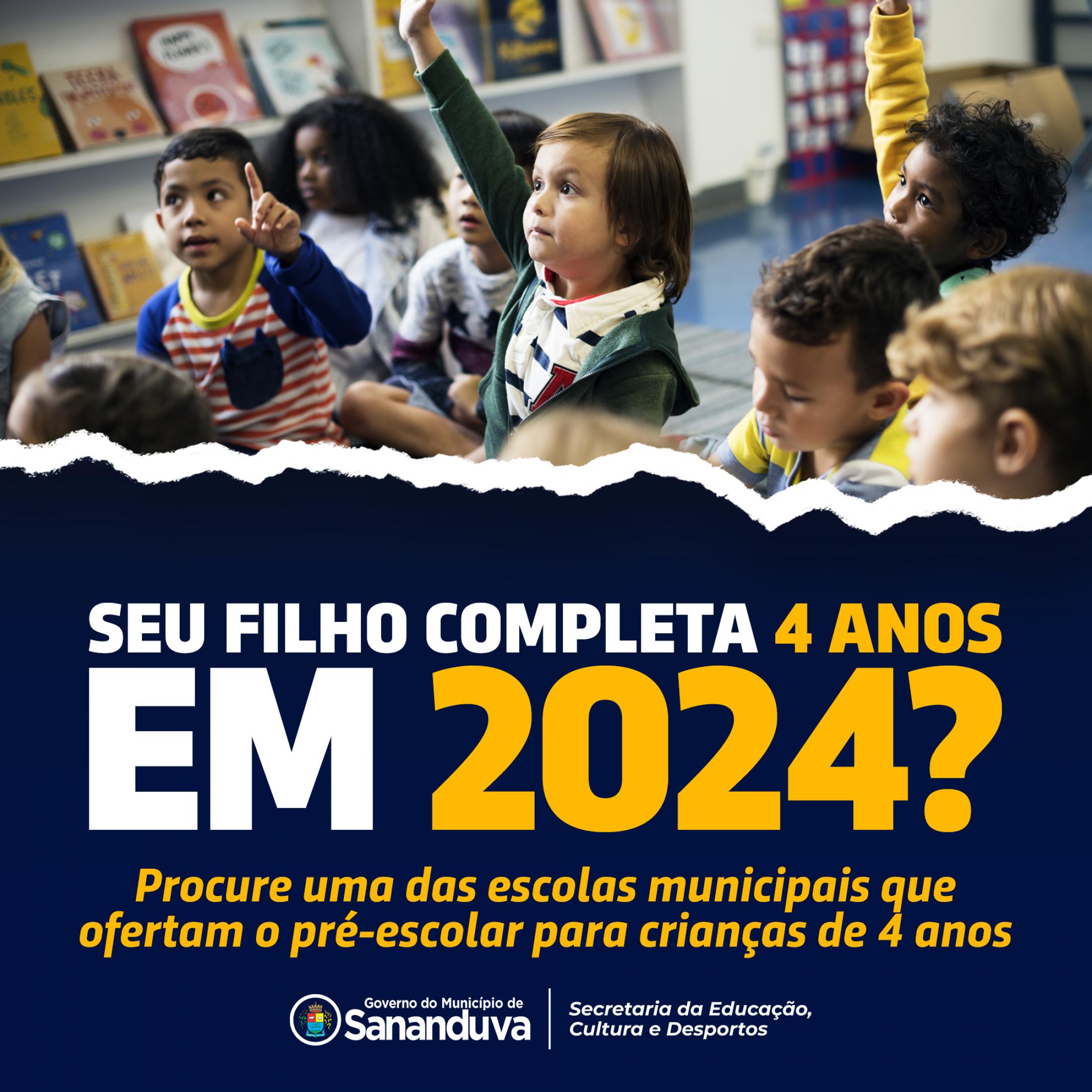 O ano letivo vai iniciar no dia 19 de fevereiro, e todas as crianças que completam 4 anos de idade até o dia 31 de março de 2024 devem estar matriculadas no pré-escolar da educação infantil, conforme prevê a lei que estabelece as diretrizes e bases da educação nacional.