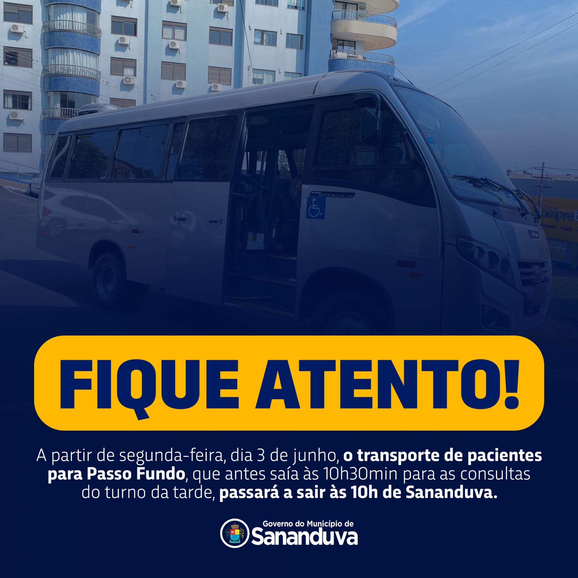 A partir de segunda-feira, dia 3 de junho, o transporte de pacientes para Passo Fundo, que antes saía às 10h30min para as consultas do turno da tarde, passará a sair às 10h de Sananduva.