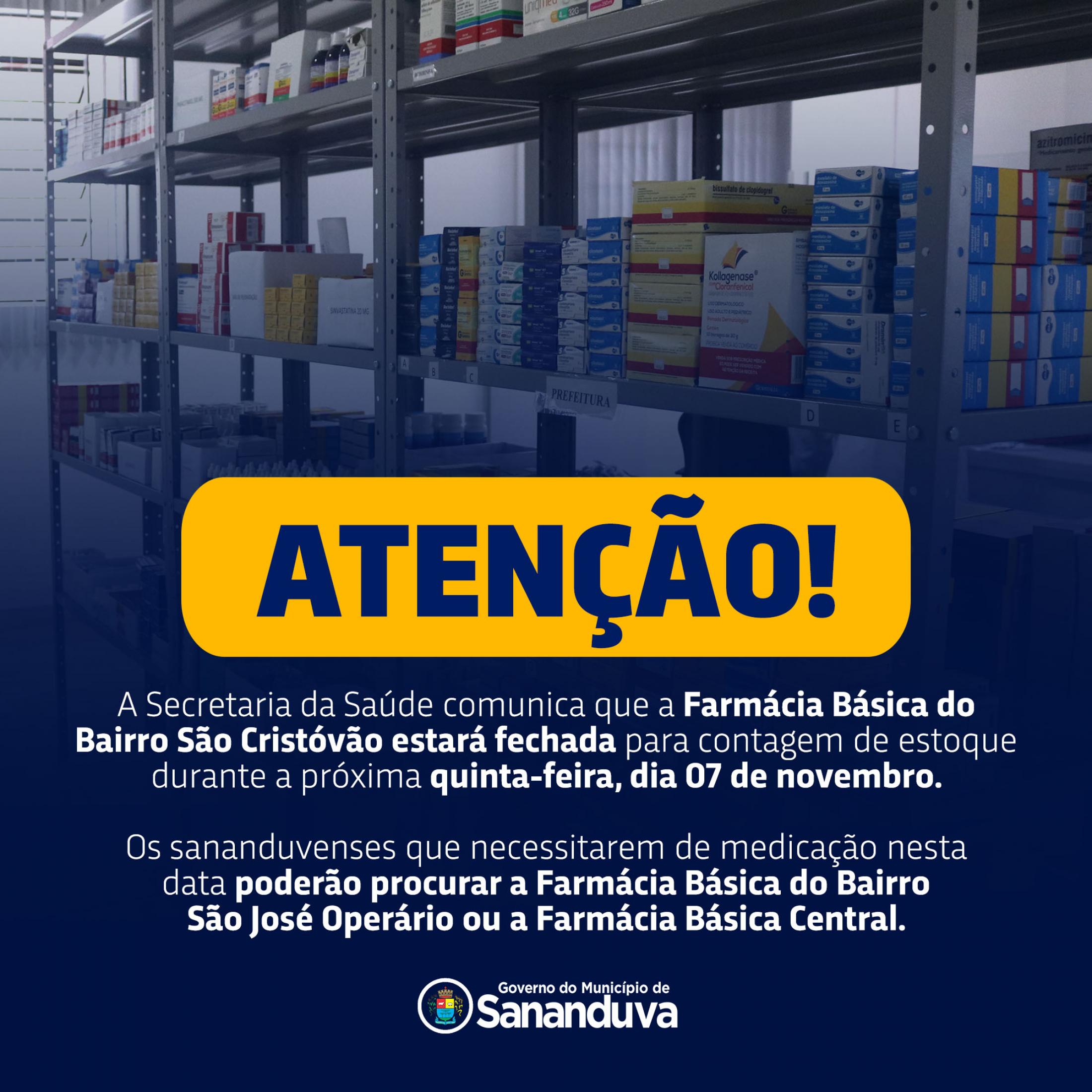 A Secretaria da Saúde comunica que a Farmácia Básica do Bairro São Cristóvão estará fechada para contagem de estoque durante a próxima quinta-feira, dia 07 de novembro.