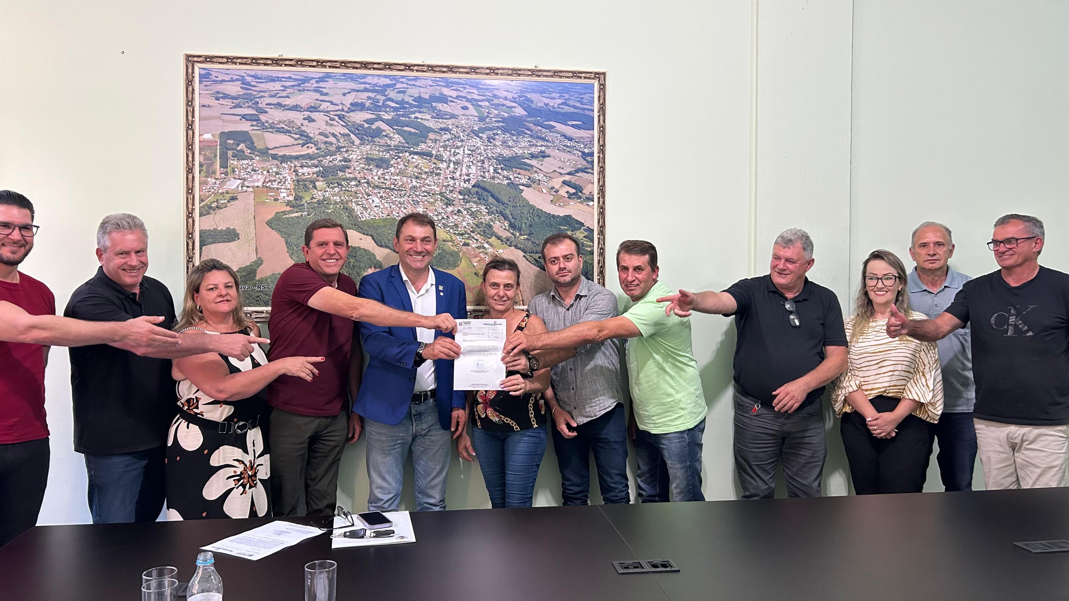 O prefeito Claiton de Aguiar e o vice, Tiago Tomielo, junto da primeira-dama, Fabiana Aguiar, vereadores, assessores parlamentares e representantes da comunidade, recepcionaram o deputado que veio ao município para entregar, pessoalmente, a emenda parlamentar que destinou a Sananduva.