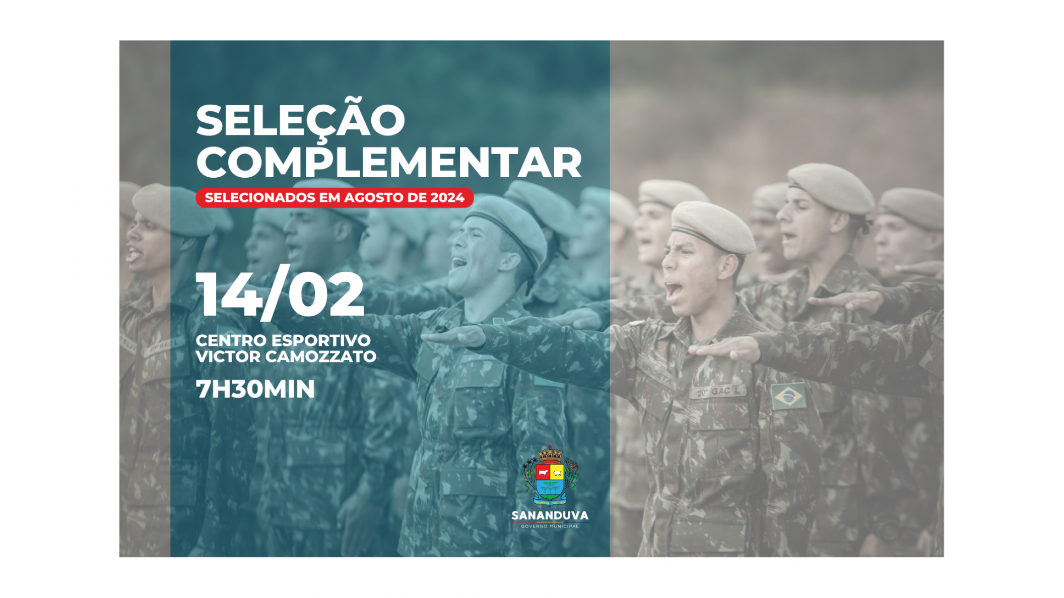 Selecionados no alistamento militar de agosto de 2024 devem comparecer no ginásio de esportes Victor Camozzato, em Sananduva, no dia 14/02/2025, às 7h30min.