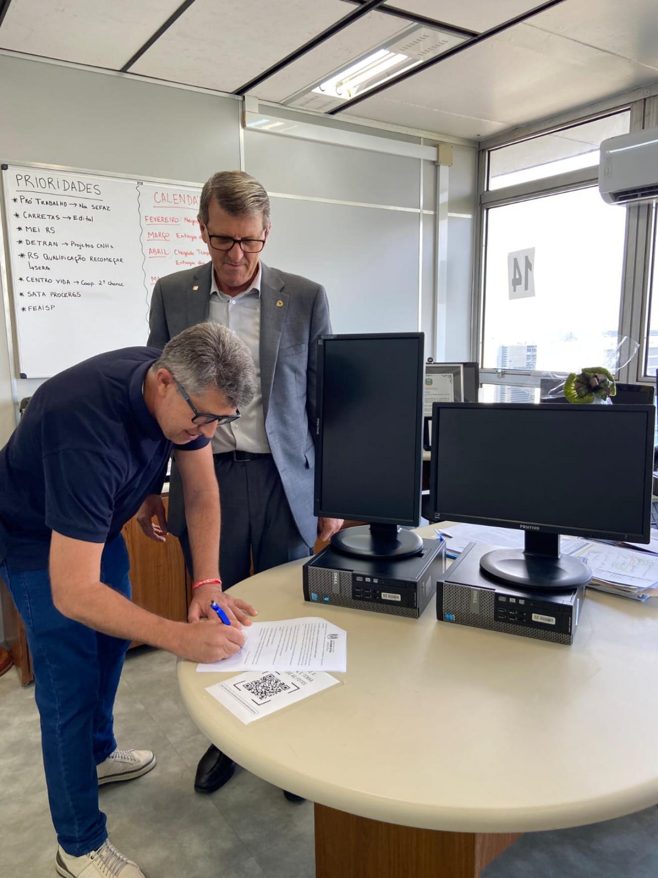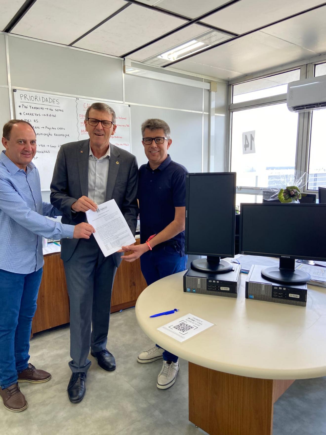 A doação dos equipamentos foi resultado de um compromisso assumido, anteriormente, quando o Prefeito, Claiton de Aguiar, e o Vice-Prefeito, Tiago Tomielo, estiveram em Porto Alegre em reunião com o Secretário Gilmar Sossella.