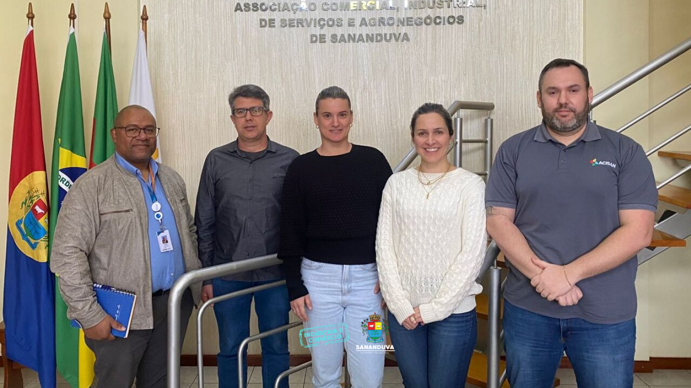 Estiveram presentes na reunião: a Vice-Presidente da ACISAN, Simone Morello; o Administrador Executivo, Robinson Pedroso; a Presidente do COMDICA, Gabriela Chiochetta Tonial; o Secretário Municipal da Inovação, Indústria, Comércio, Trabalho e Serviços, Cleber Augusto Spiller; e o Executivo de Soluções Corporativas do SENAC, Gilson Ferreira.