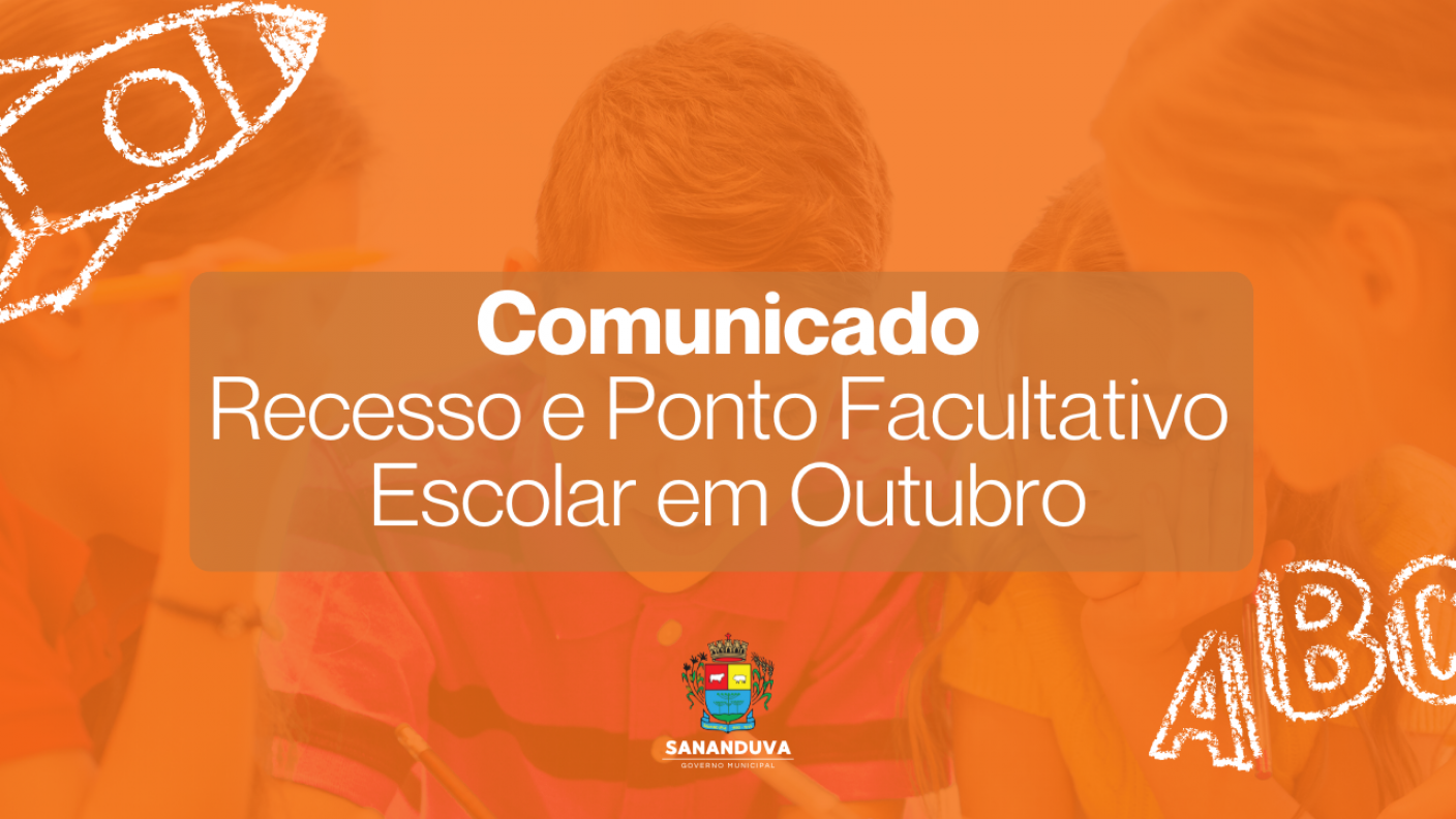 A Secretaria Municipal de Educação informa que não haverá aulas nos dias 13 e 14 de outubro em todas as escolas da rede municipal de ensino.