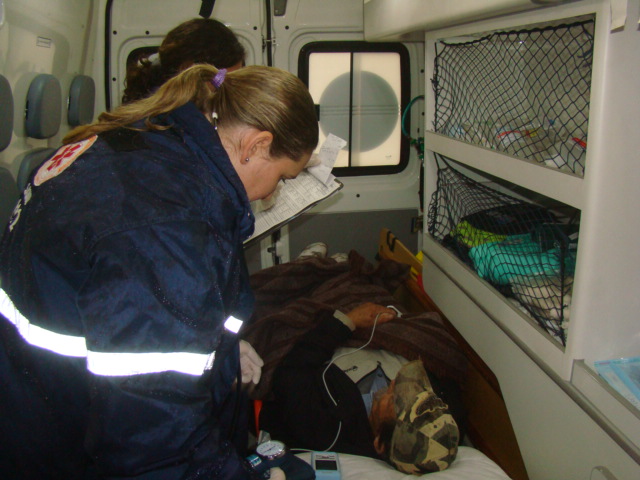 Como o objetivo era acompanhar de perto o trabalho da equipe, seguimos para o local da ocorrência quando a Central de Regulação liberou o deslocamento da ambulância. O paciente que aguardava atendimento estava visivelmente debilitado e desidratado e encontrava-se em local de difícil acesso. Como chovia no momento do atendimento, a equipe prontamente o removeu para dentro da ambulância para examiná-lo. Depois dos procedimentos de anamnese, avaliação de enfermagem e verificação de sinais vitais, a técnica de enfermagem de plantão ligou para o médico da Central de Regulação para repassar as informações do caso, sendo que o mesmo orientou a puncionar acesso venoso com administração de soro fisiológico e removê-lo para o Hospital São João, onde o paciente foi encaminhado terminando o atendimento do SAMU.