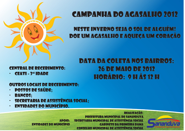 A administração municipal, através da Secretaria de Assistência Social e Gabinete da Primeira-Dama, lança neste mês de maio mais uma edição da Campanha do Agasalho com o slogan “Neste Inverno Seja o Sol de Alguém - Doe Um Agasalho e Aqueça um Coração!”.