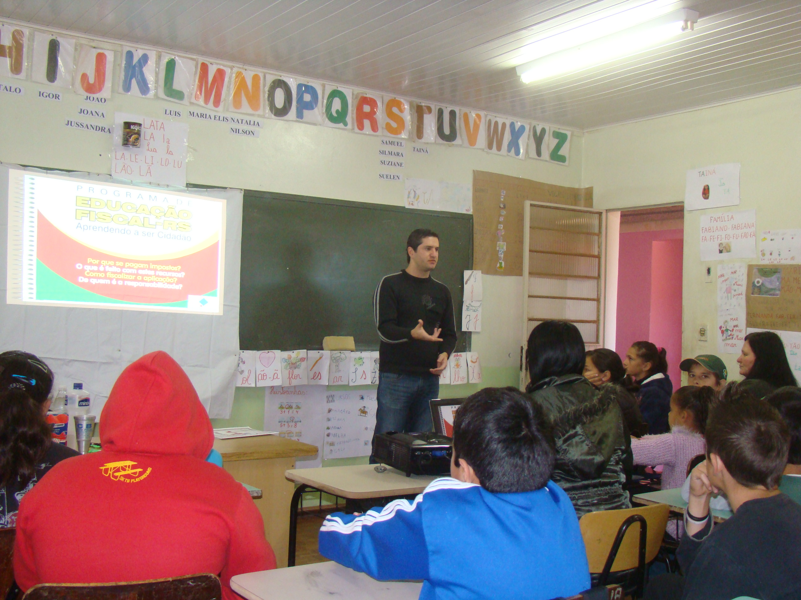 Na manhã do dia 18 de maio, na Escola Municipal Ernesto Raymundi, no Bairro Vila Jardim, foi realizada uma palestra sobre Educação Fiscal, proferida pelo secretário da Fazenda, Lucas Nunes de Paula.